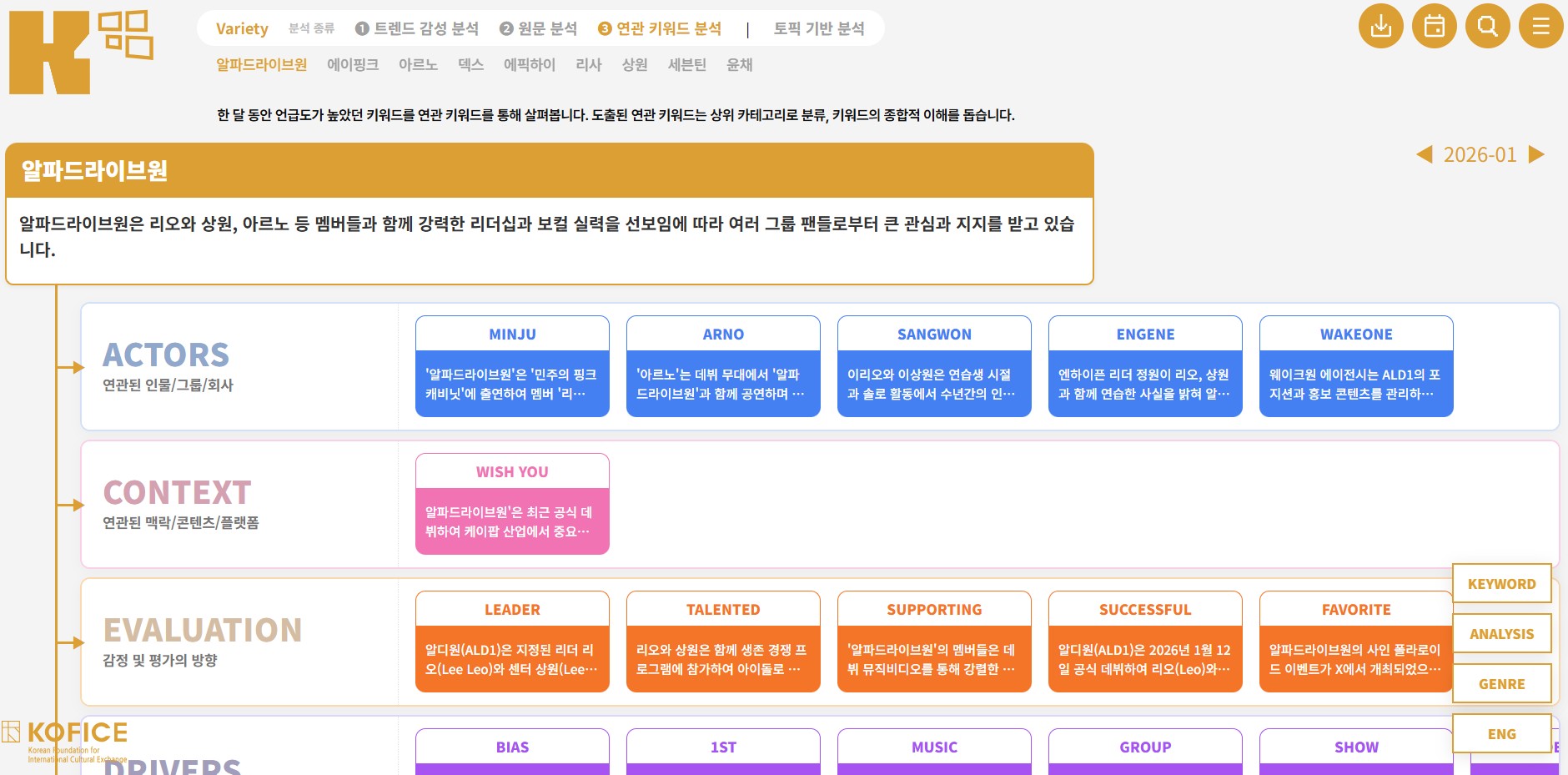 이번 개편으로 분석 장르는 기존 음악, 영화 & 드라마, 예능, 웹툰에 K-소비재인 푸드와 뷰티를 추가해 6개 장르로 확대됐으며, 영어·아랍어 외에 인도네시아어·스페인어·태국어 데이터를 추가 수집해 글로벌 권역 분석을 강화했다.