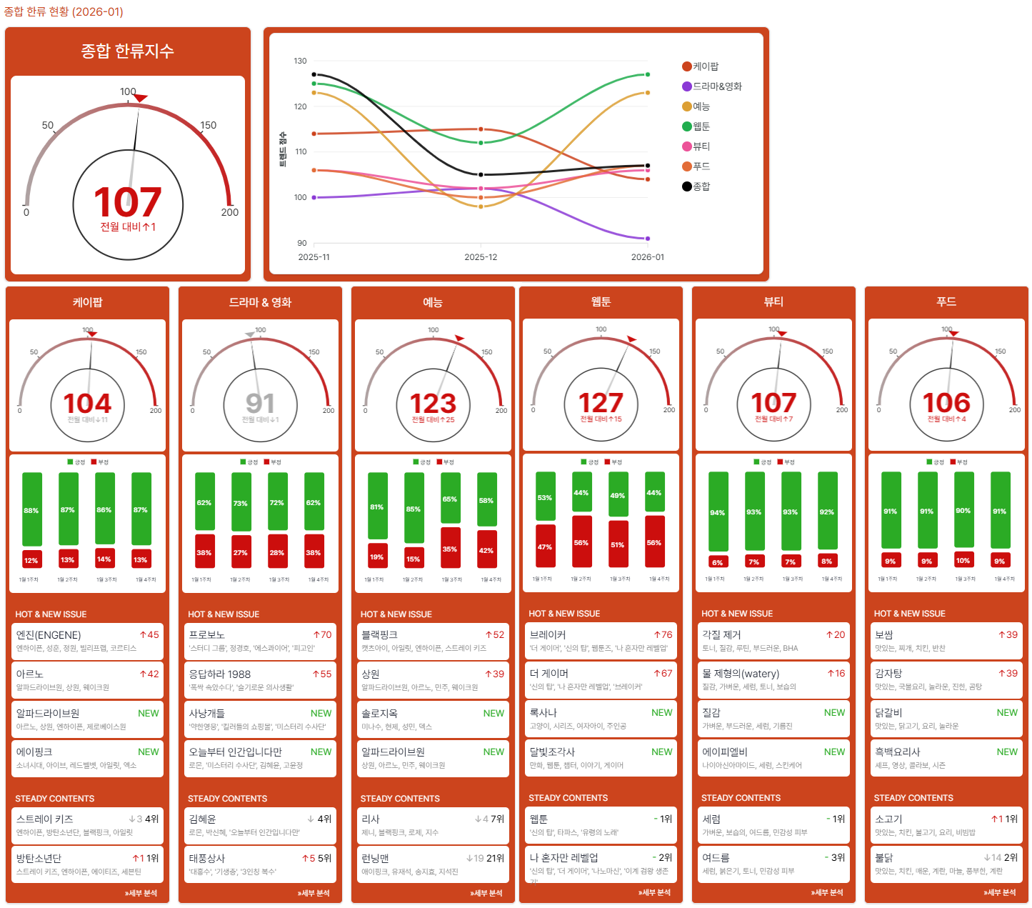 매월 업데이트되는 ‘월간 종합 리포트’는 한류지수 변화, 장르별 주요 키워드 랭킹, 긍·부정 감성 분석, 연구자 분석 코멘트를 종합 제공한다.