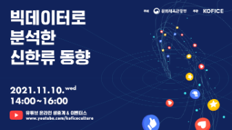 빅데이터로 분석한 신한류 동향  - 일시: 2021년 11월 10일(수), 14:00~16:00 - 장소: 온라인(https://www.youtube.com/user/koficeculture) - 프로그램 제1부 빅데이터와 신한류 동향(발표) 발표 1. 한류 거대자료 수집 및 활용방안(채지영 연구위원, 한국문화관광연구원) 발표 2. 빅데이터로 분석한 신한류 트렌드 (김흥선 전무·하창주 과장, 미소정보기술) 제2부 한류 빅데이터의 도전과 발전(토론) 채지영 (한국문화관광연구원 연구위원) 하창주 (미소정보기술 과장) 박종구 (한국방송광고진흥공사 연구위원) 현은정 (홍익대학교 경영대학 교수) 김홍기 (Space Oddity 대표) 윤호기 (글림미디어 대표) ​​​