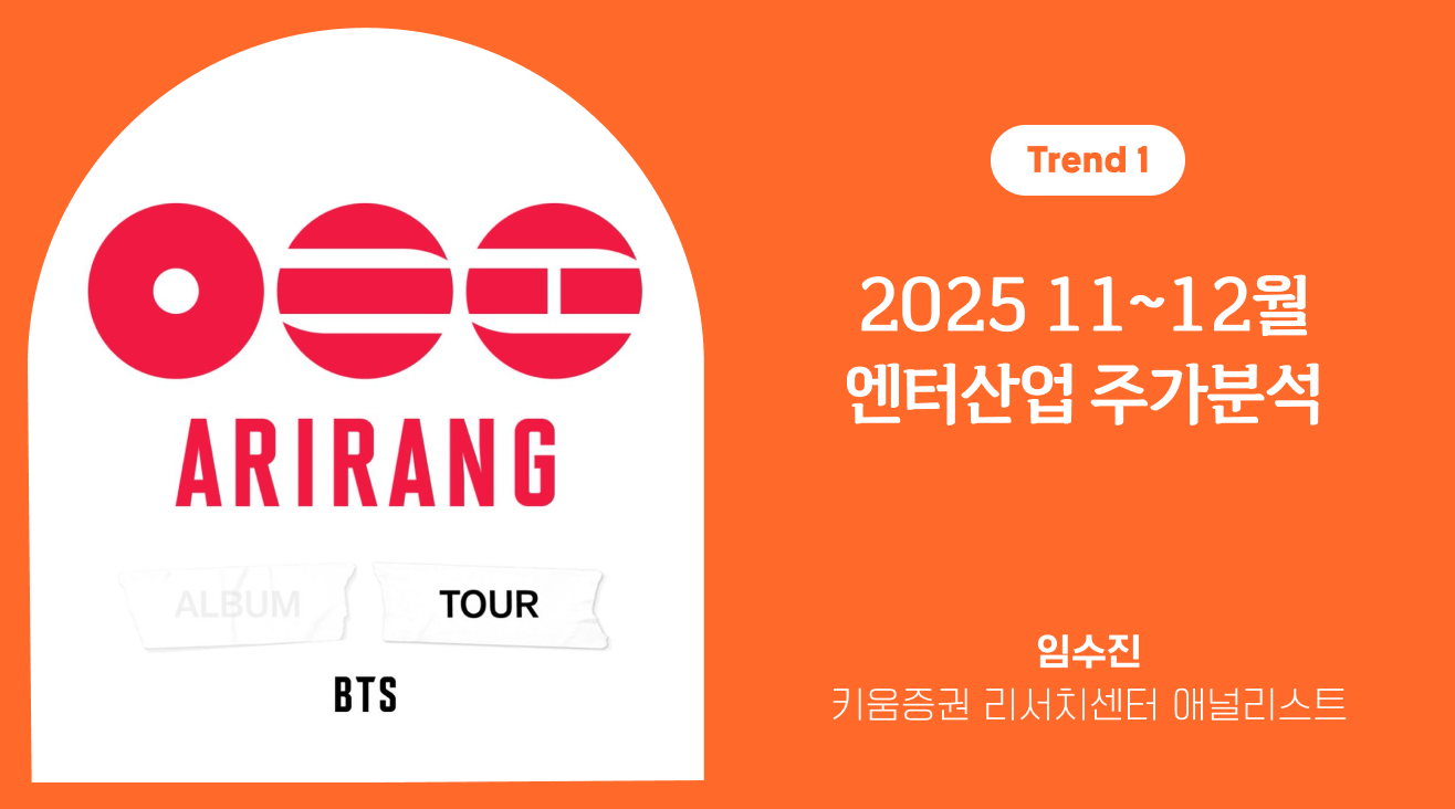 2025년 11~12월 엔터 업종은 전체 주가지수 반등 국면에서 업종 전체가 함께 움직이기보다는, 개별 이슈에 따라 주가 흐름이 갈리는 모습이 이어졌다. 11월에는 3분기 실적 발표 이후 기대치가 낮아지며 주가 조정이 나타났고, 12월에는 대형 아티스트 관련 뉴스와 정책 기대가 다시 반등의 계기로 작용했다. 이 기간 동안 시장은 단기 실적보다 향후 산업 환경이 어떻게 바뀔지를 더 중요하게 보기 시작했다. 이러한 흐름 속에서 가장 큰 영향을 준 변수는 방탄소년단의 컴백 가시화였다. 방탄소년단 복귀는 단순한 음반 발매나 투어 재개를 넘어 MD 판매, 플랫폼 이용 증가, 콘텐츠와 광고 매출까지 함께 움직일 수 있는 요소이며, 일정과 투어 규모가 구체화될수록 추가적인 상향 가능성도 남아 있다.
