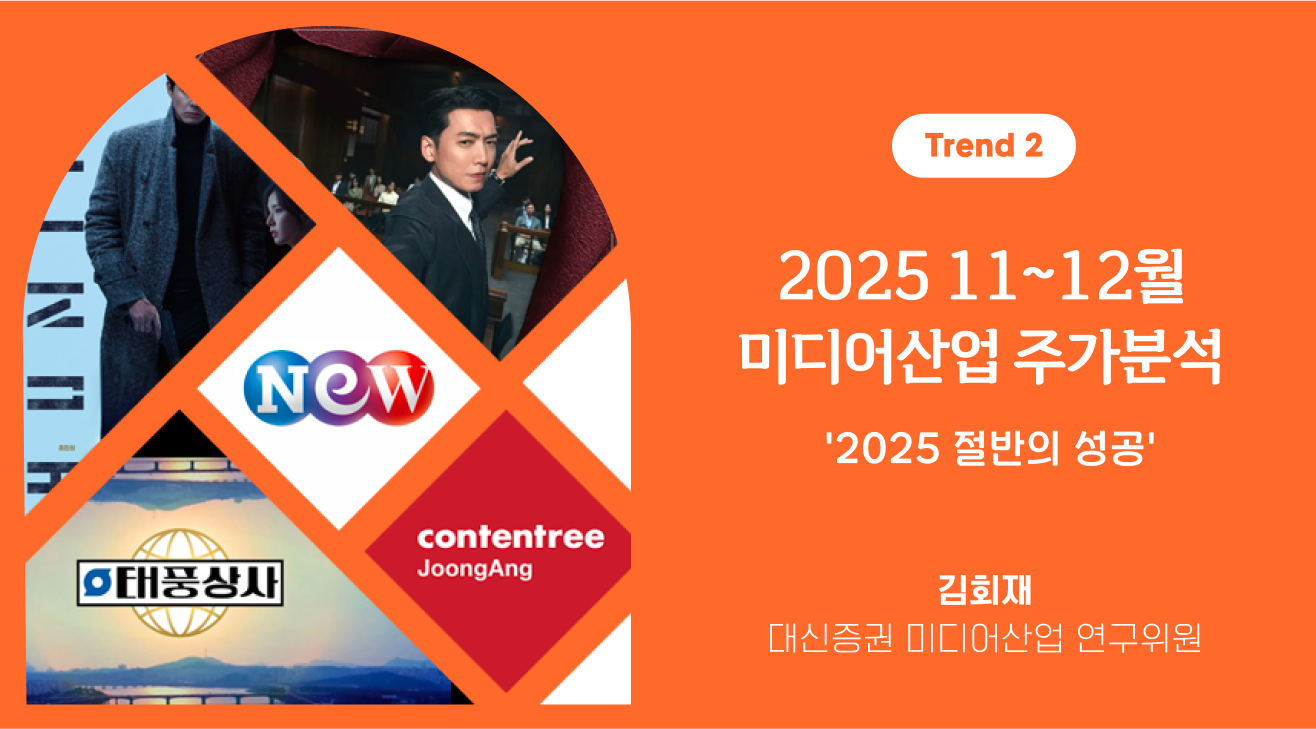 미디어산업의 11~12월 주가는 7~8월 및 9~10월에 이어서 약세를 보였다. 주요 8개 종목의 주가는 -19.8% ~ +3.7%로 합산 시가총액은 -7.2% 하락했다. 동기간 코스피는 +2.6% 상승, 코스닥은 +2.8% 상승해, 8개 기업 중 NEW +0.9%를 제외한 7개 기업은 모두 지수 대비 언더퍼폼했다. 2025년 연간 기준 미디어산업의 주가는 +5.2% 상승해, 2023년 -35.2% 하락, 2024년 -25.3% 하락 후 소폭이나마 반등에 성공했으나, 코스피와 코스닥이 각각 +75.6%와 +36.5% 상승해, 지수 대비로는 모두 언더퍼폼했다. 광고 부진이 예상되면서 매체 광고가 위축되기 시작한 2023년 이후 누적 미디어산업의 주가는 -49.1% 하락했고, 동기간 코스피는 +88.45, 코스닥은 +36.2% 상승했다.