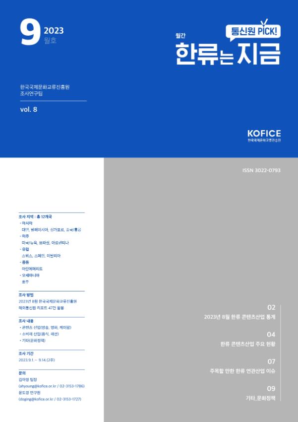 * ISSN 3022-0793 Ⅰ. 2023년 8월 한류 콘텐츠산업 통계 | 2 Ⅱ. 한류 콘텐츠산업 주요 현황 | 4 Ⅲ. 주목할 만한 한류 연관산업 이슈 | 7 Ⅳ. 기타_문화정책 | 9 □ 조사 지역: 총 12개국 · 아시아(대만, 말레이시아, 싱가포르, 중국/홍콩) · 미주(미국/뉴욕, 브라질, 아르헨티나) · 유럽(스위스, 스페인, 이탈리아) · 중동(아랍에미리트) · 오세아니아(호주) □ 조사 방법 · 2023년 8월 한국국제문화교류진흥원 해외통신원 리포트 47건 활용 □ 조사 내용 · 콘텐츠 산업(방송, 영화, 케이팝) · 소비재 산업(음식, 패션) · 기타(문화정책) □ 조사 기간 · 2023.9.1. ∼ 9.14.(2주) □ 문의 · 김아영 팀장(ahyoung@kofice.or.kr / 02-3153-1786) · 윤도경 연구원(doging@kofice.or.kr / 02-3153-1727)