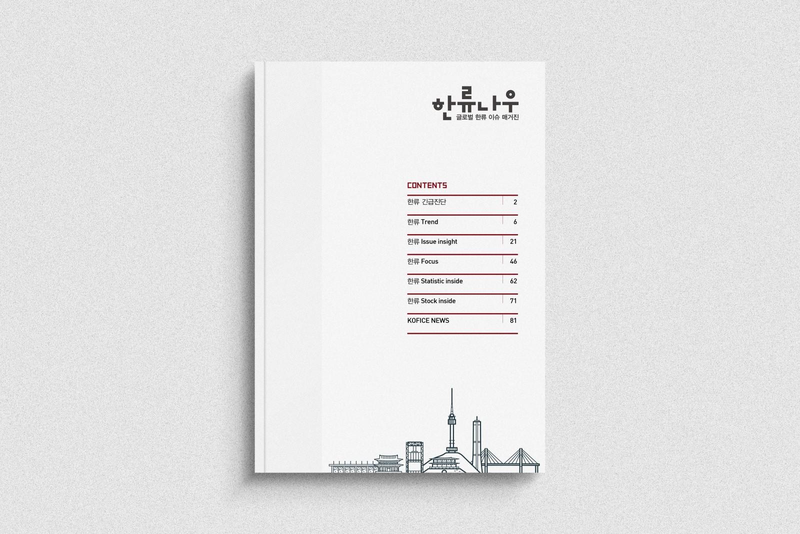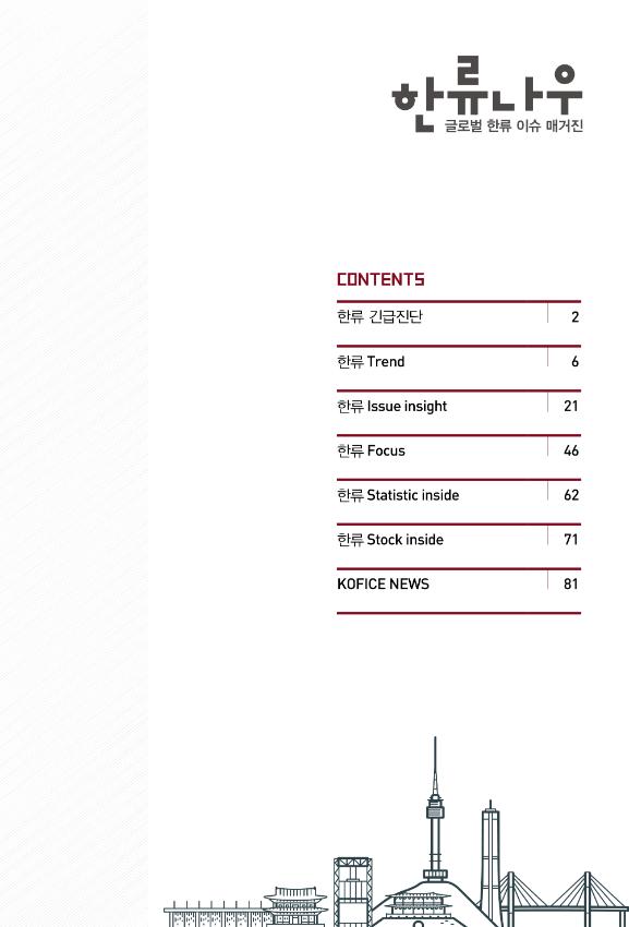 I. 한류 긴급진단: 사드가 약이 되는 이유 II. 한류 Trend III. 한류 Issue insight: 핫 소비 트렌드로 떠오른 한식 - 교민식당에서 미슐랭 스타 레스토랑으로 진화하는 한식의 현지화 - 프랜차이즈 해외 진출 현황과 전망 IV. 한류 Focus - '상장 대박' 네이버 라인, 글로벌 메신저로 자리매김할 수 있을까 - 문학한류와 번역의 현주소 V. 한류 Statistic inside - 한류-제조업 분야 - 한류-관광 분야 - 한류-한국문화 분야 VI. 한류 Stock inside - 2016년 2분기 한류산업 주가 분석 VII. KOFICE NEWS