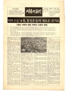 박스번호: D021 목록번호: 131015023 내용: 타오르는 6월, 통일운동의 새로운 전기로 : 6.10남북학생회담은 노태우정권의 폭력적 원천봉쇄로 무산되었다. 서울민통련 5차 임시총회 : 새의장에 최창학 선생 6.29선언은 사기선언이다