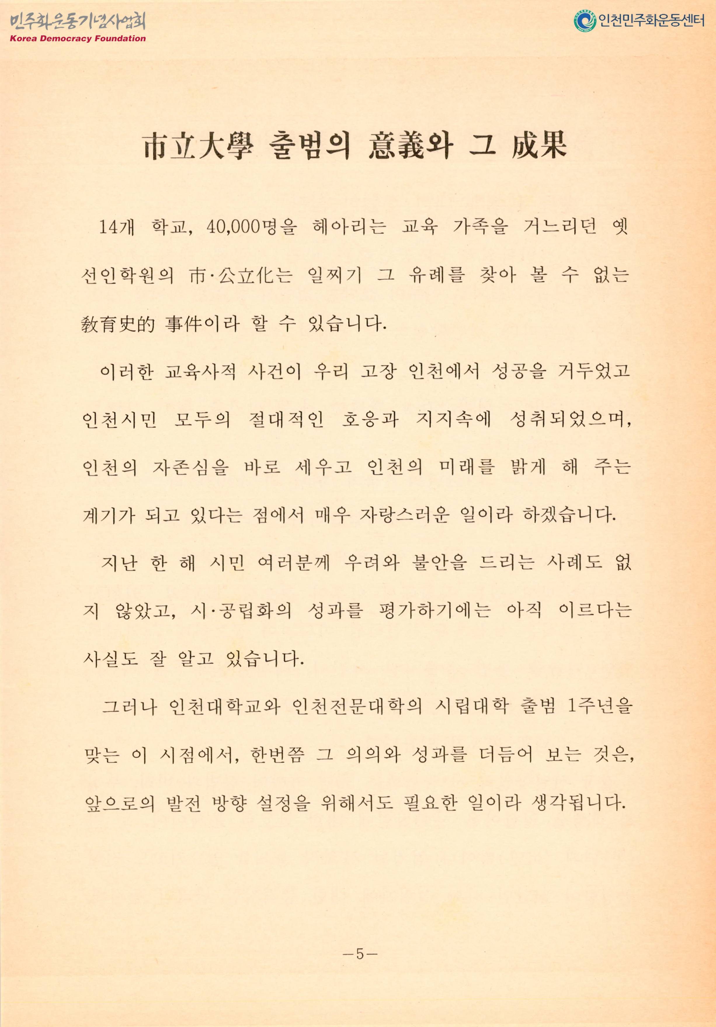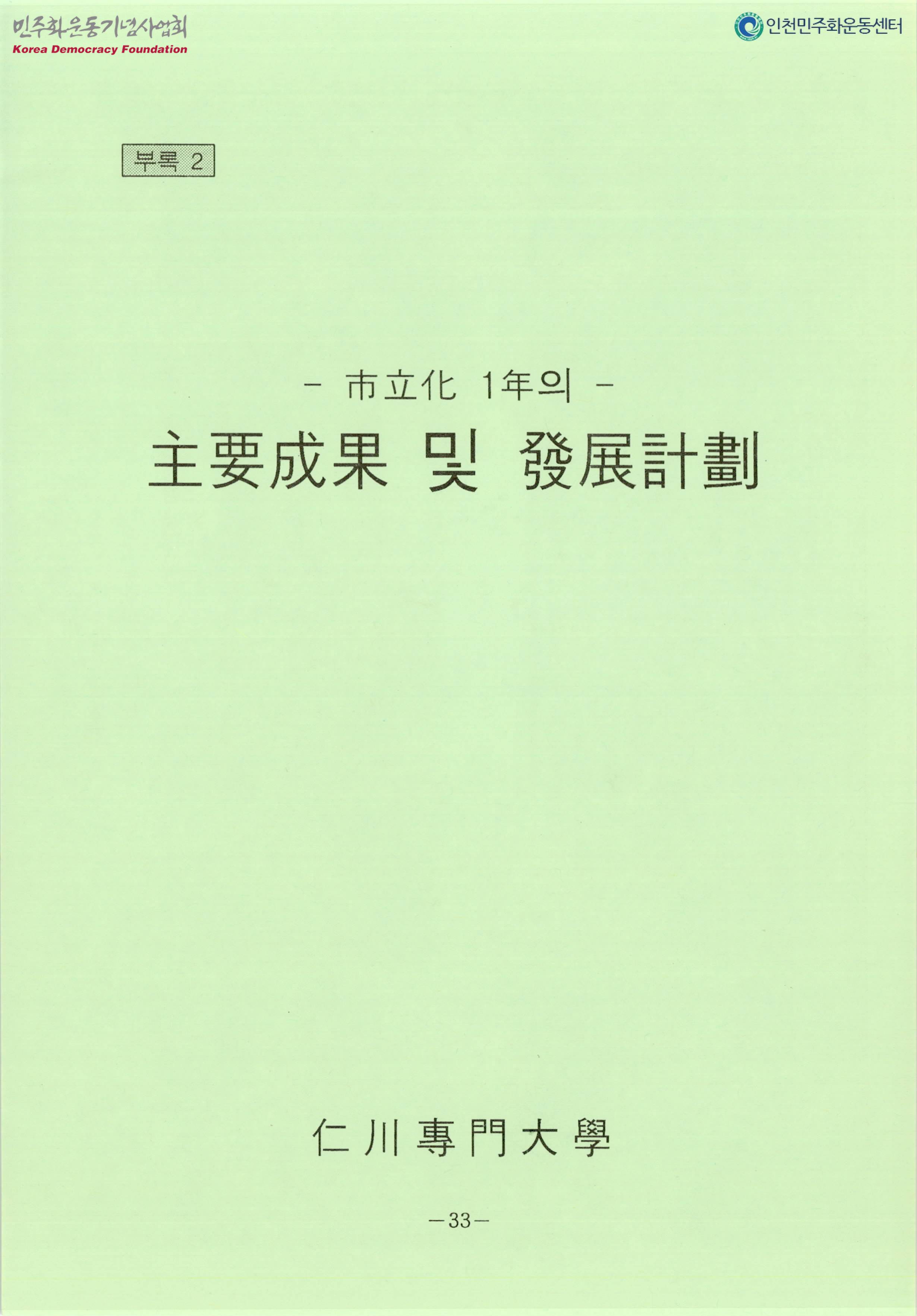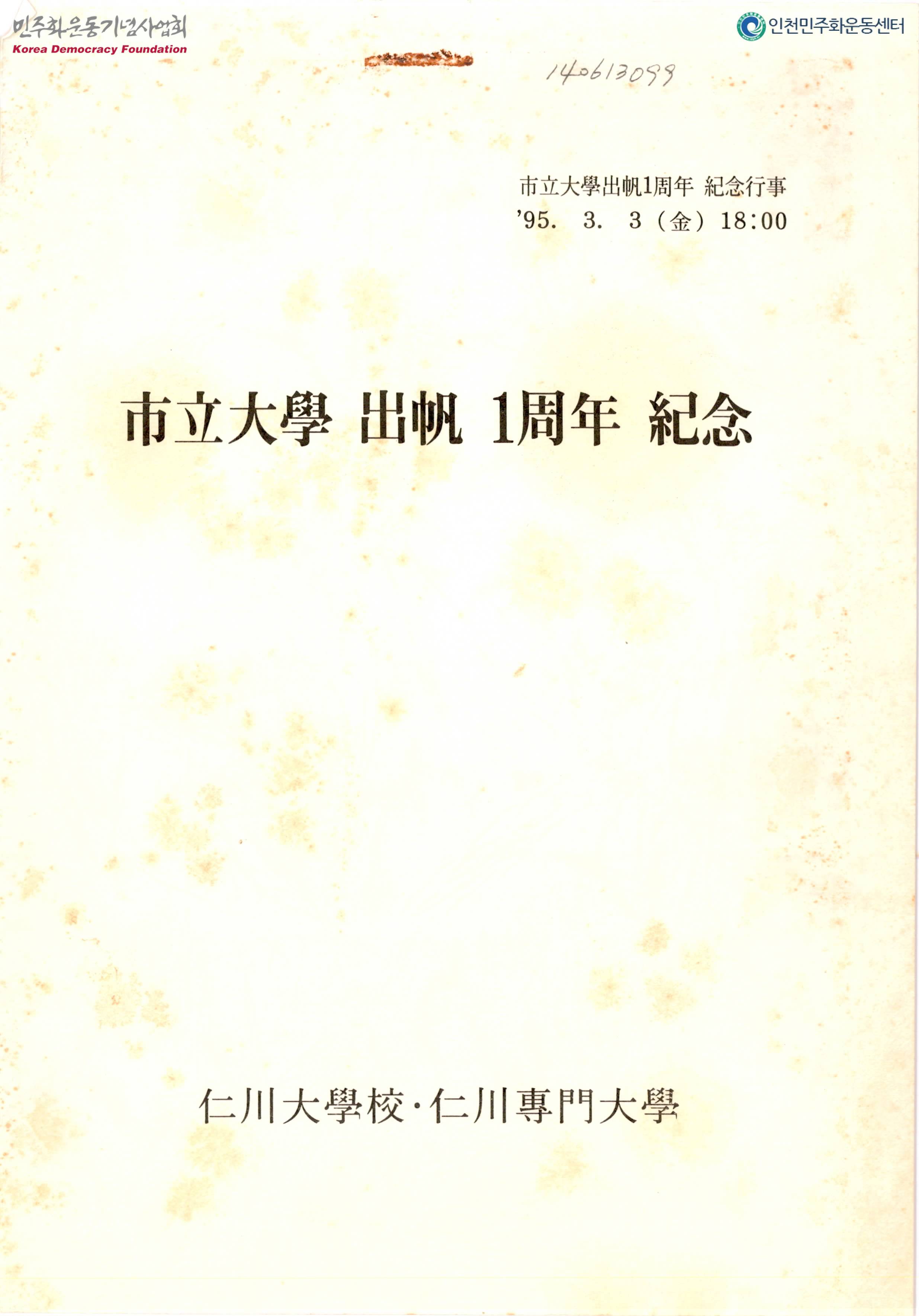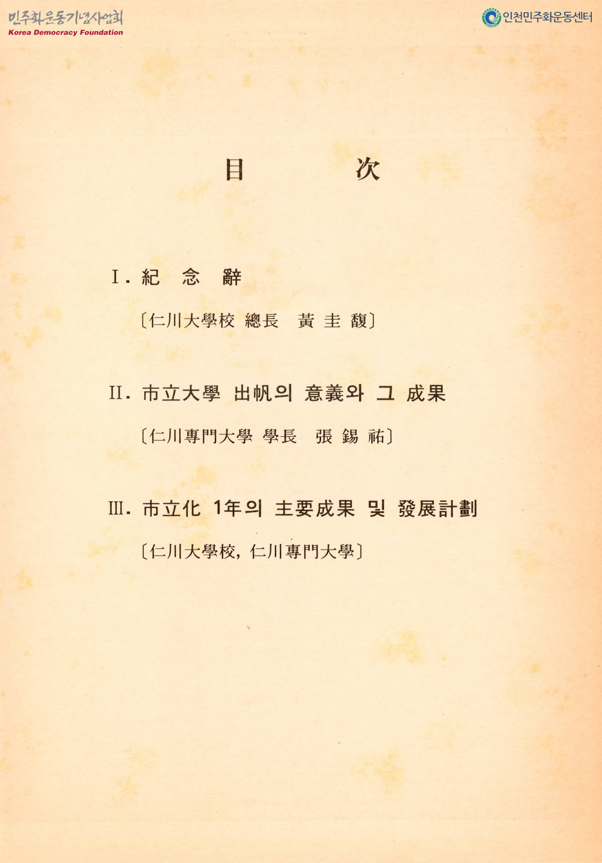 내용: 자료집. 기념사. 시립대학 출범의 의의 와 그 성과. 시립화 1년의 주요성과 및 발전계획.