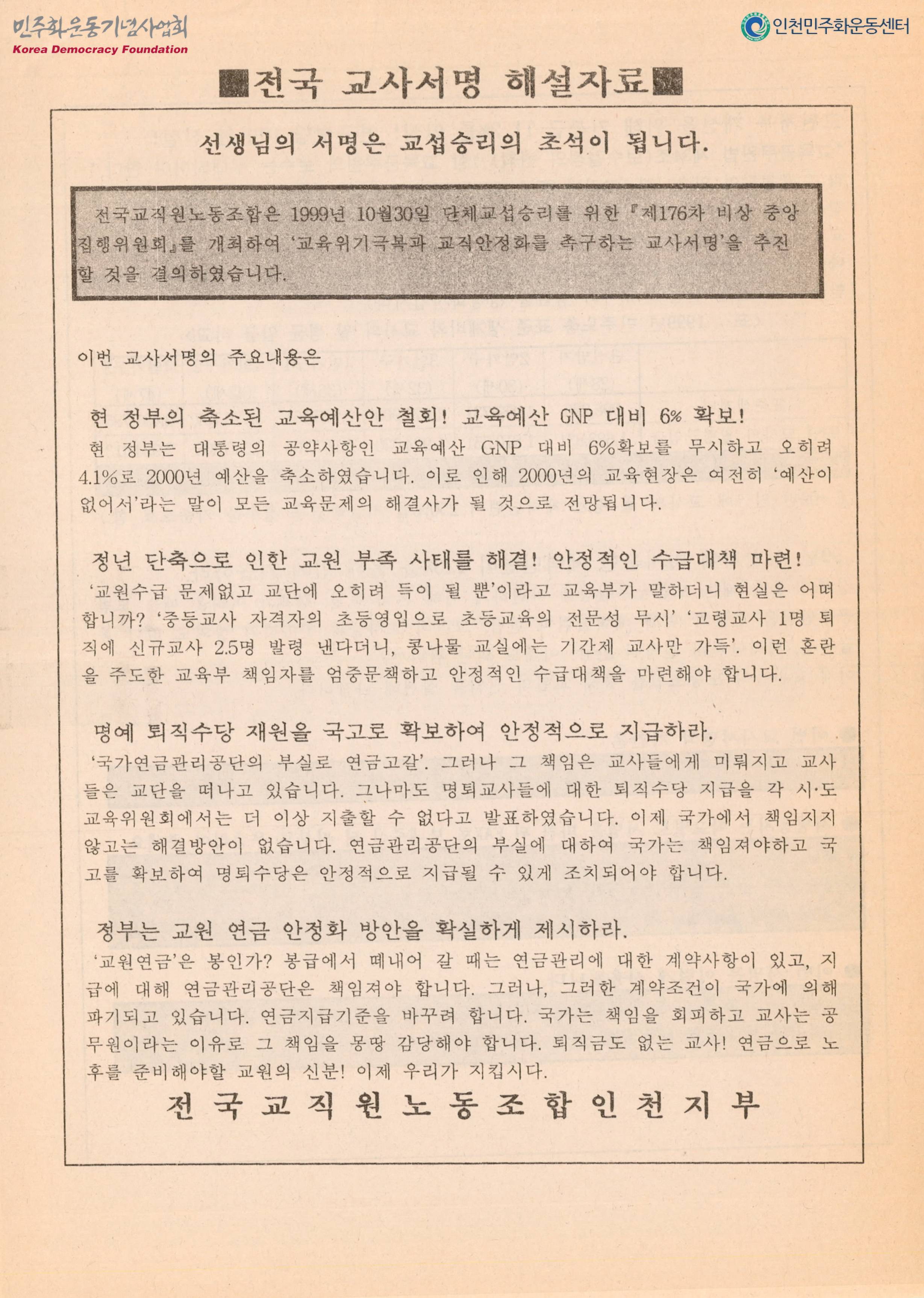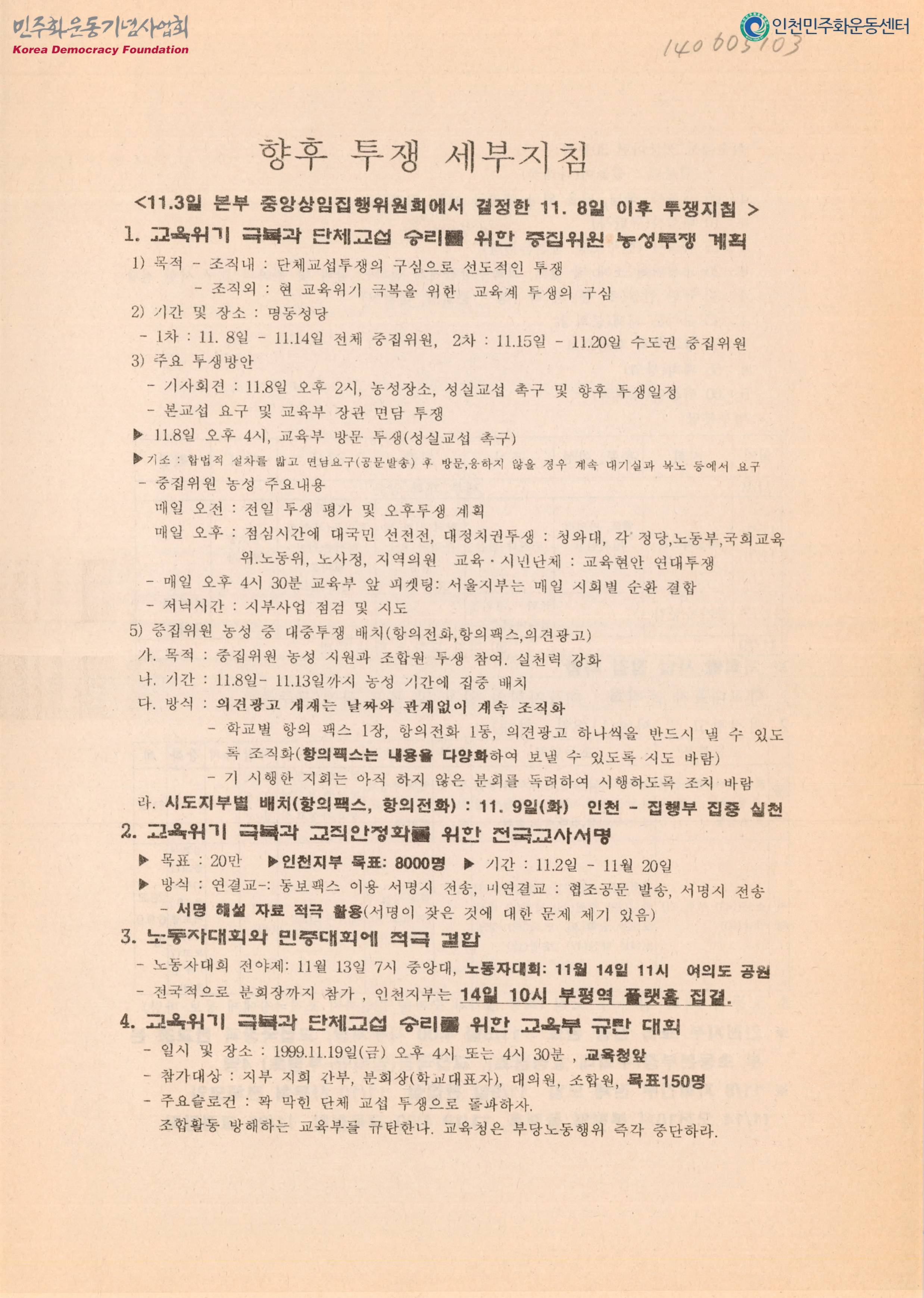 내용: 본부 중앙상집에서 결정한 투쟁지침.교육위기 극복과 단체교섭 승리 농성투쟁 계획.교사서명.교육부규탄전국교사서명해설