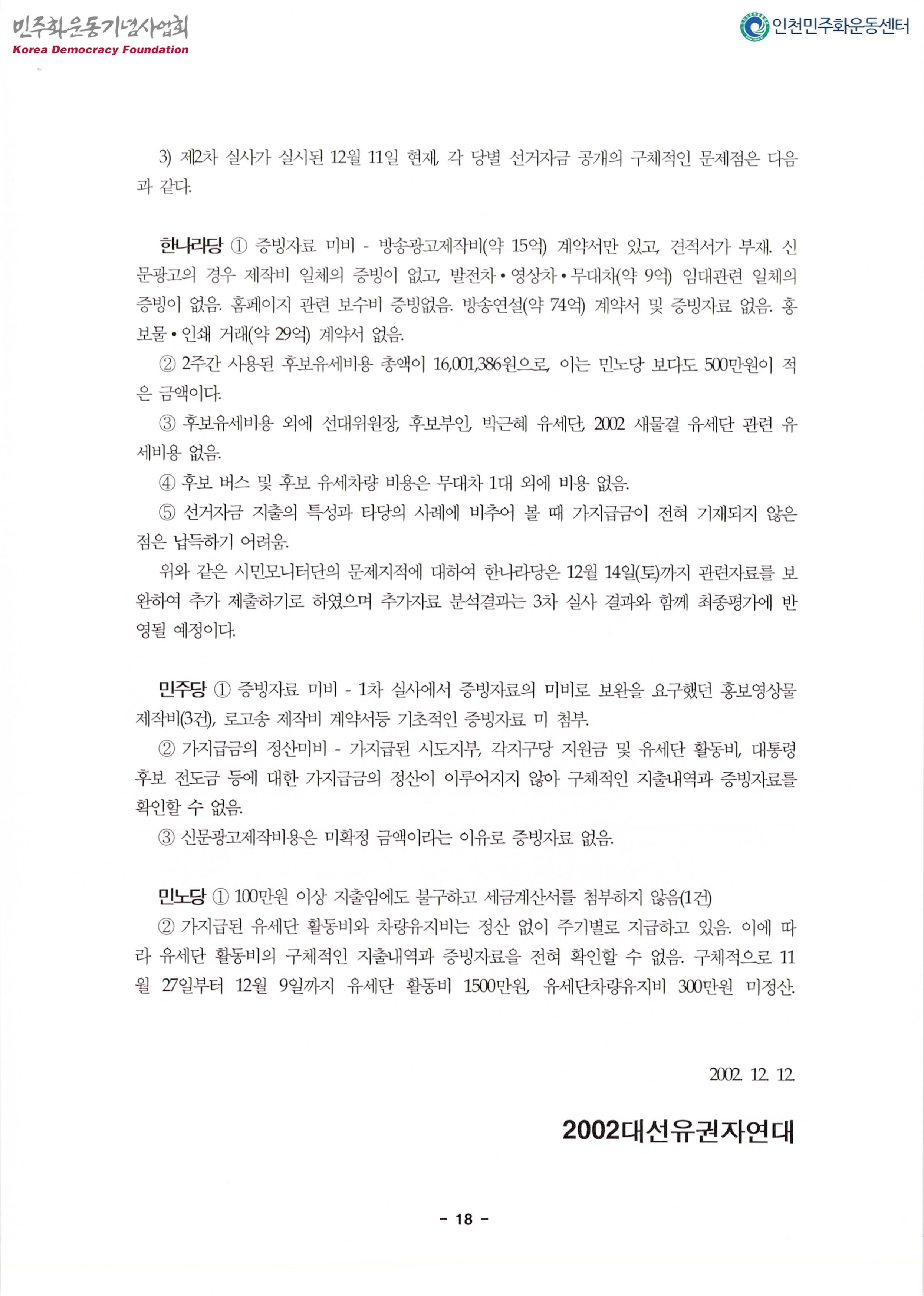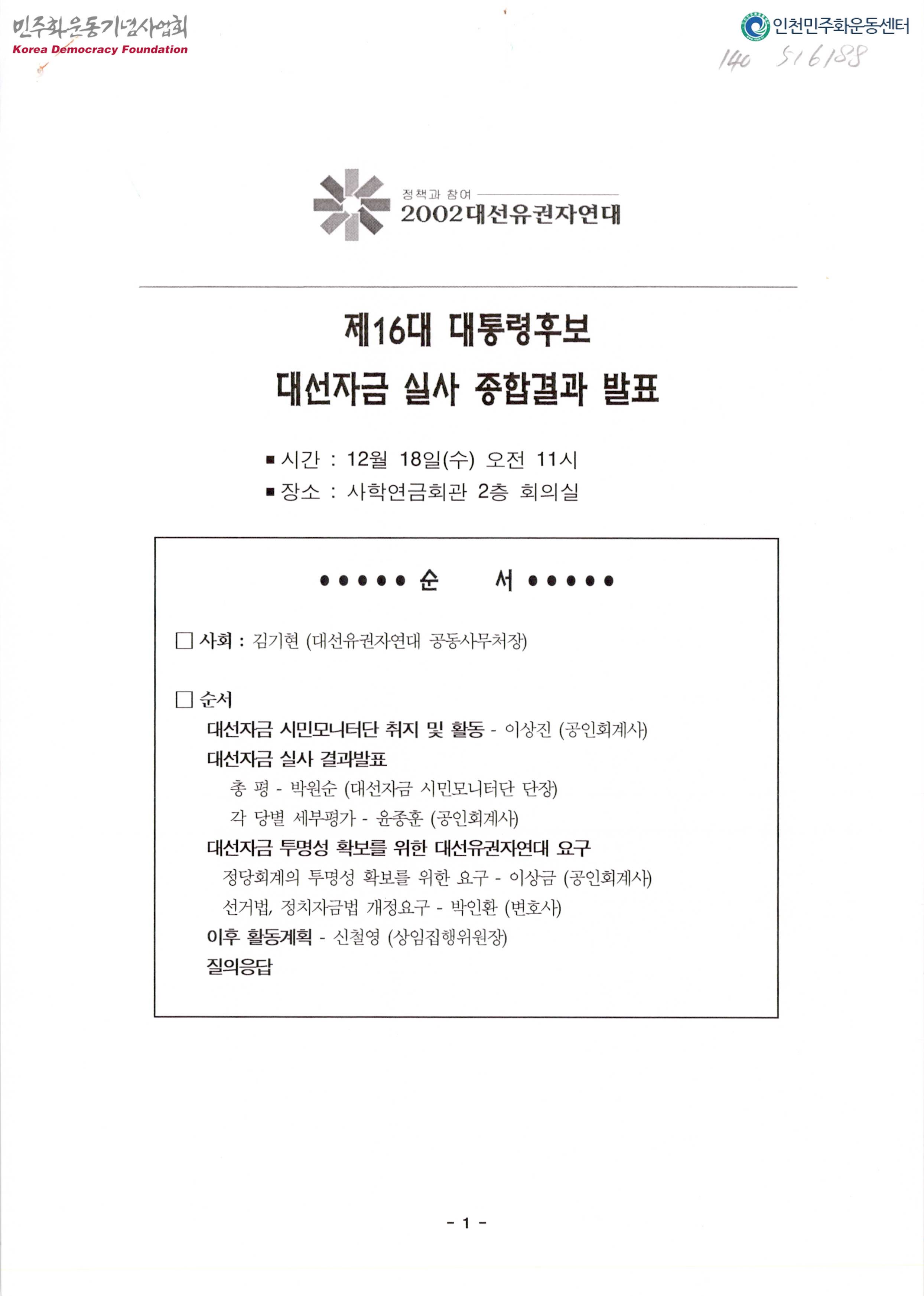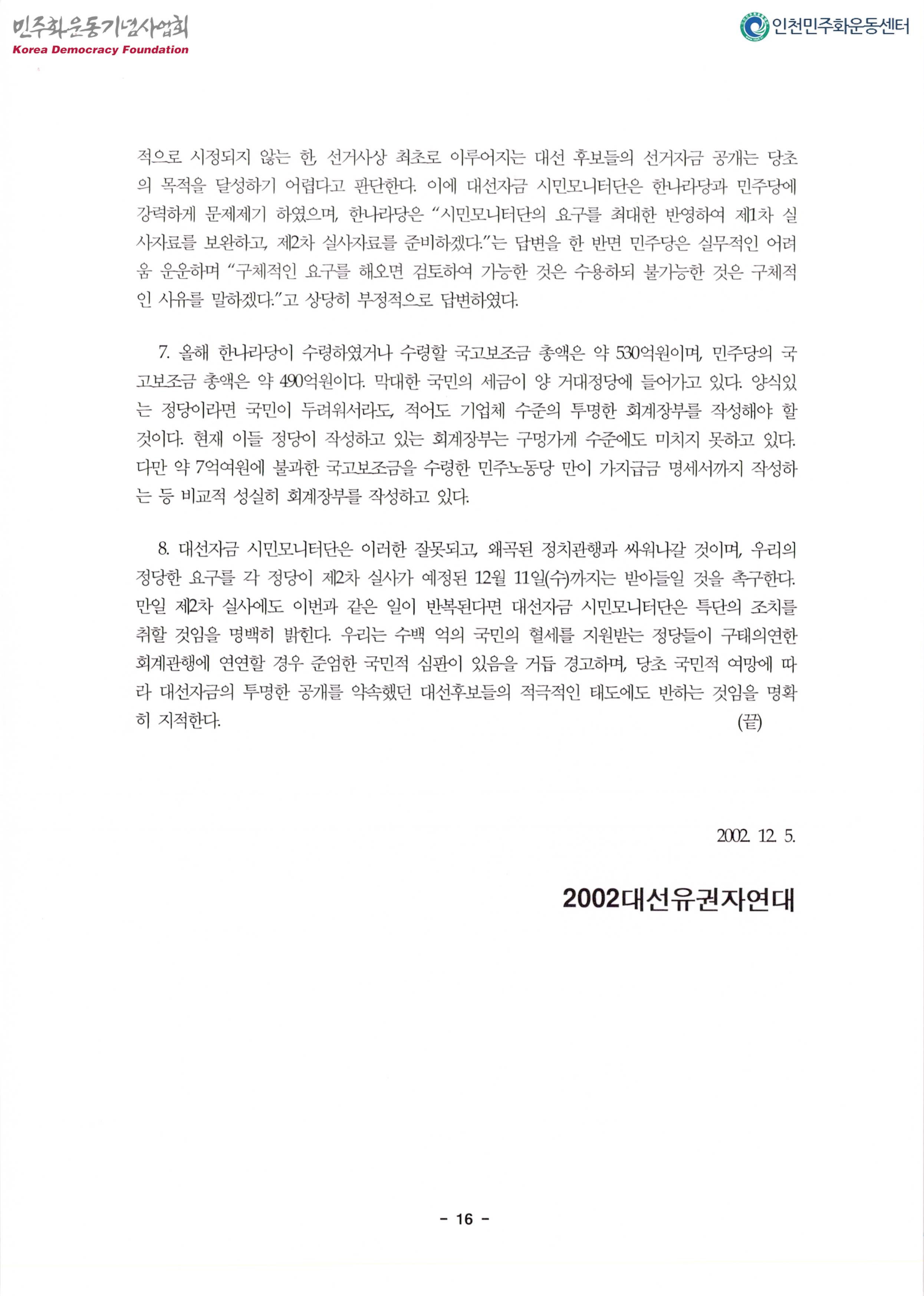 제16대 대통령후보 대선자금실사 종합결과 발표