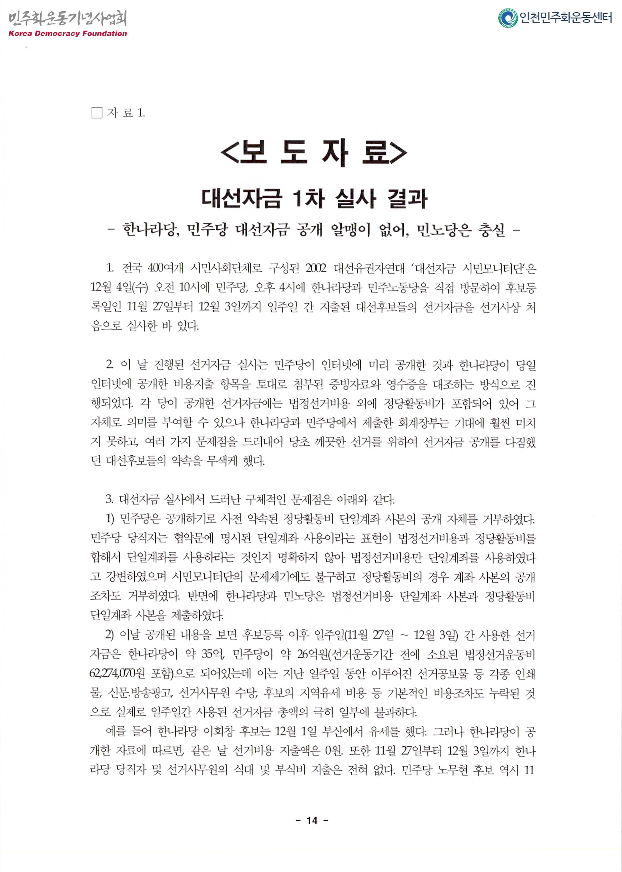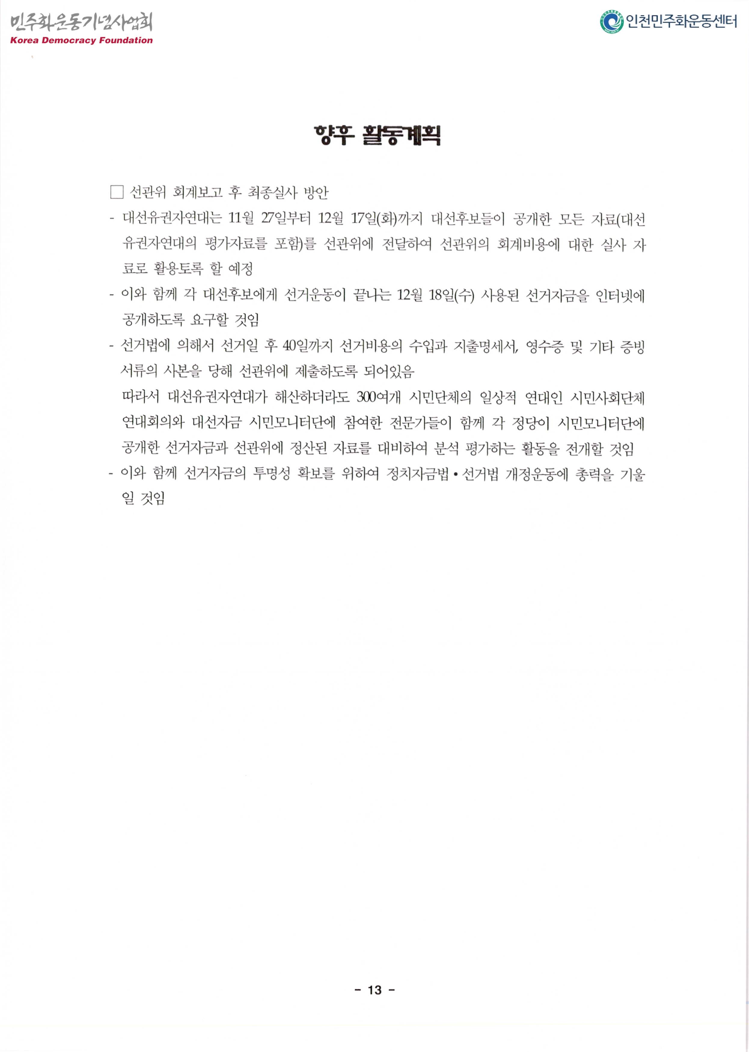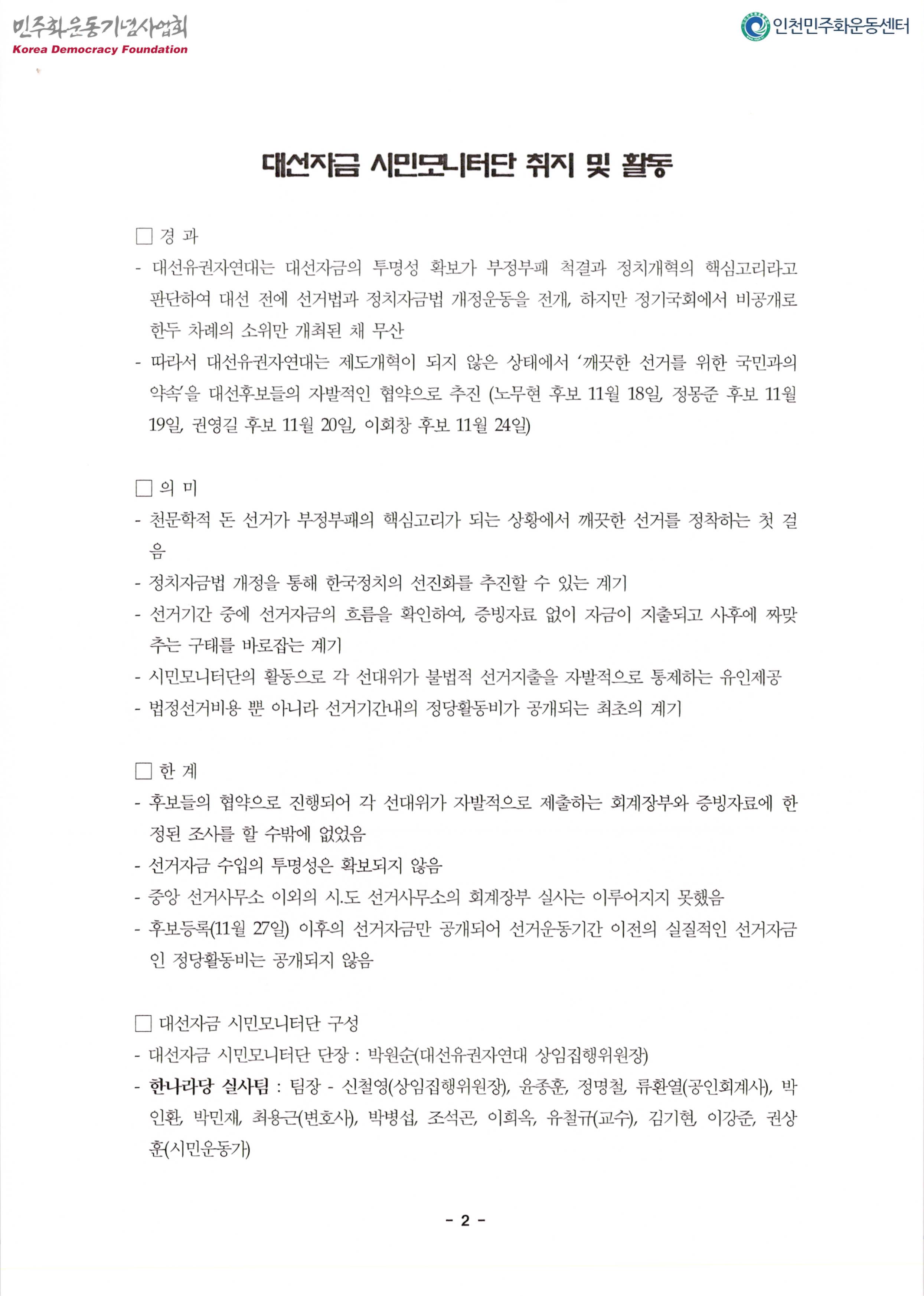 내용: 대선자금시민모니터단활동,결과발표.대선자금투명성확보를 위한 요구,활동계획