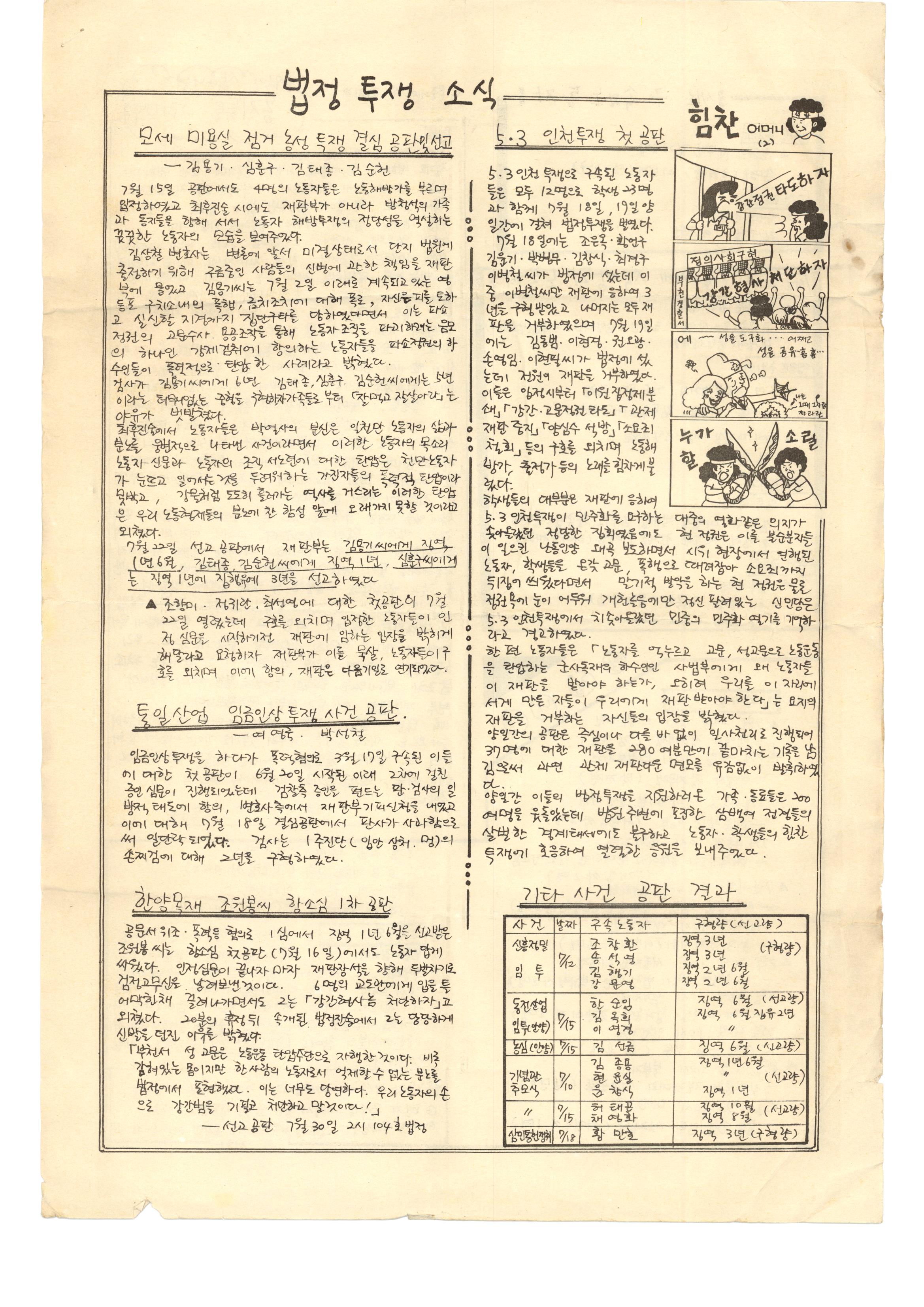 인천5.3투쟁 첫공판 : 12명의 노동자와 23명의 학생이 7월 18일 19일에 법정투쟁을 벌렸다. 이들은 입정때 부터 '이원집정부제 분쇄, 강간고문정권 타도, 관제재판 중지를 외쳤다.