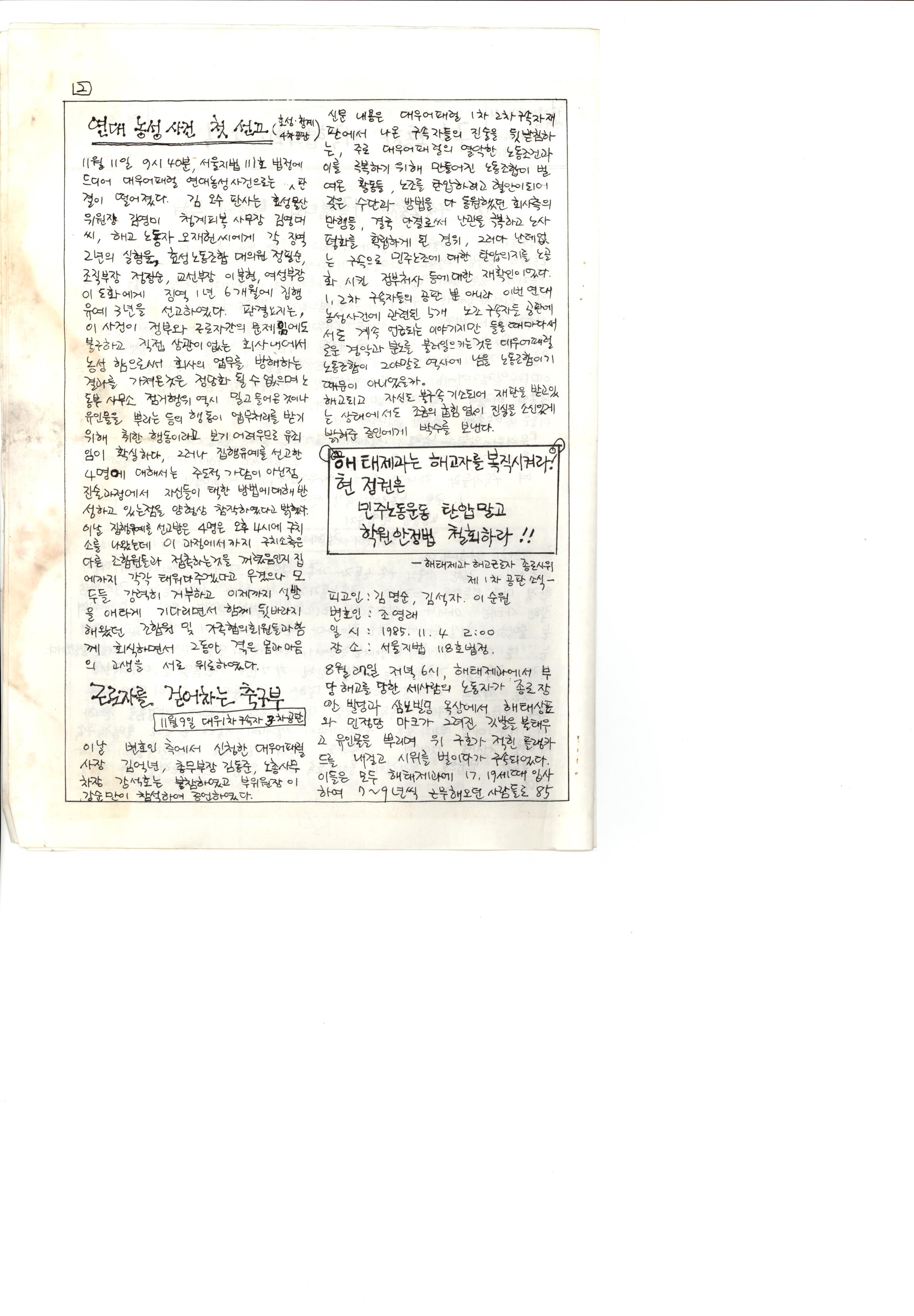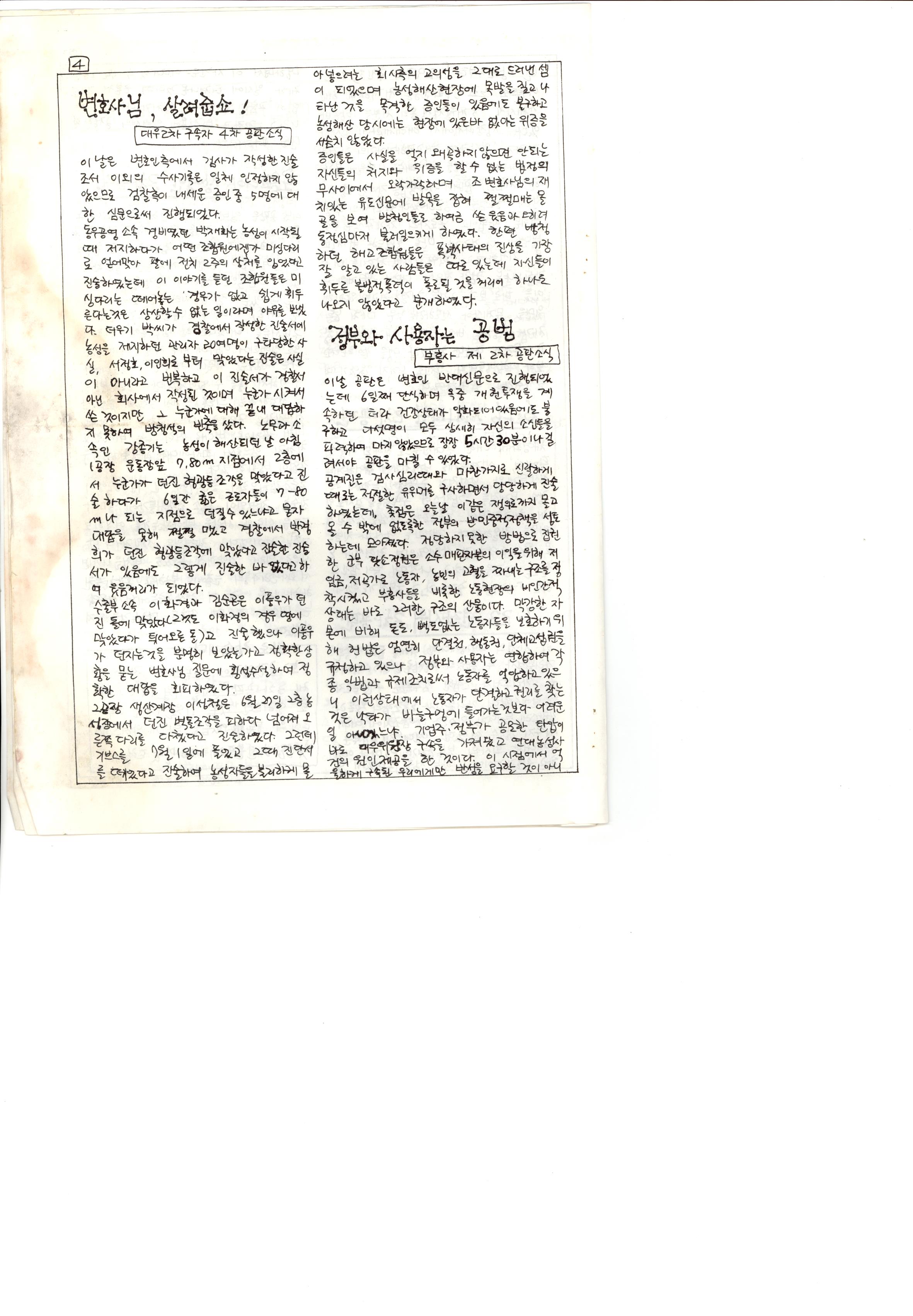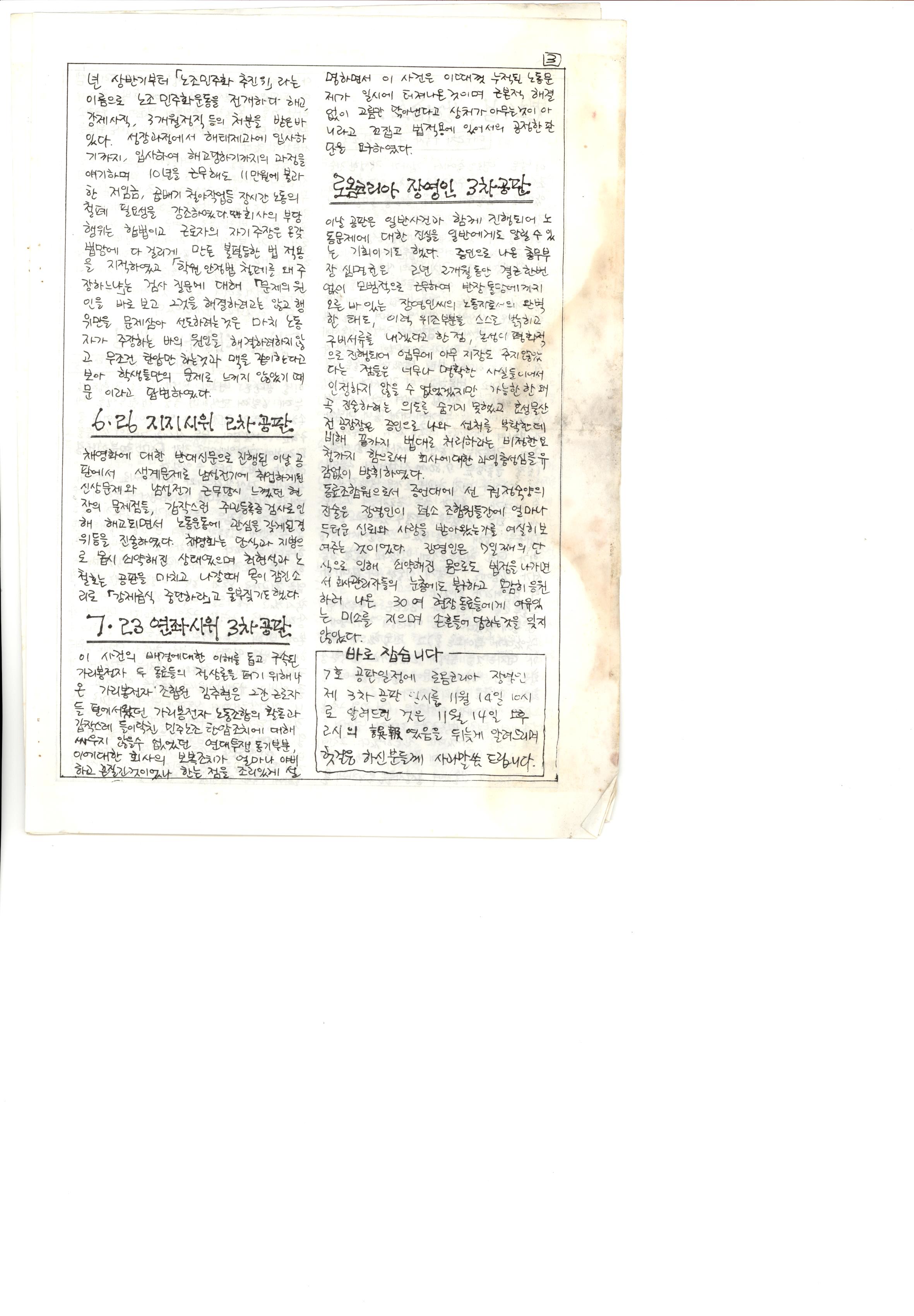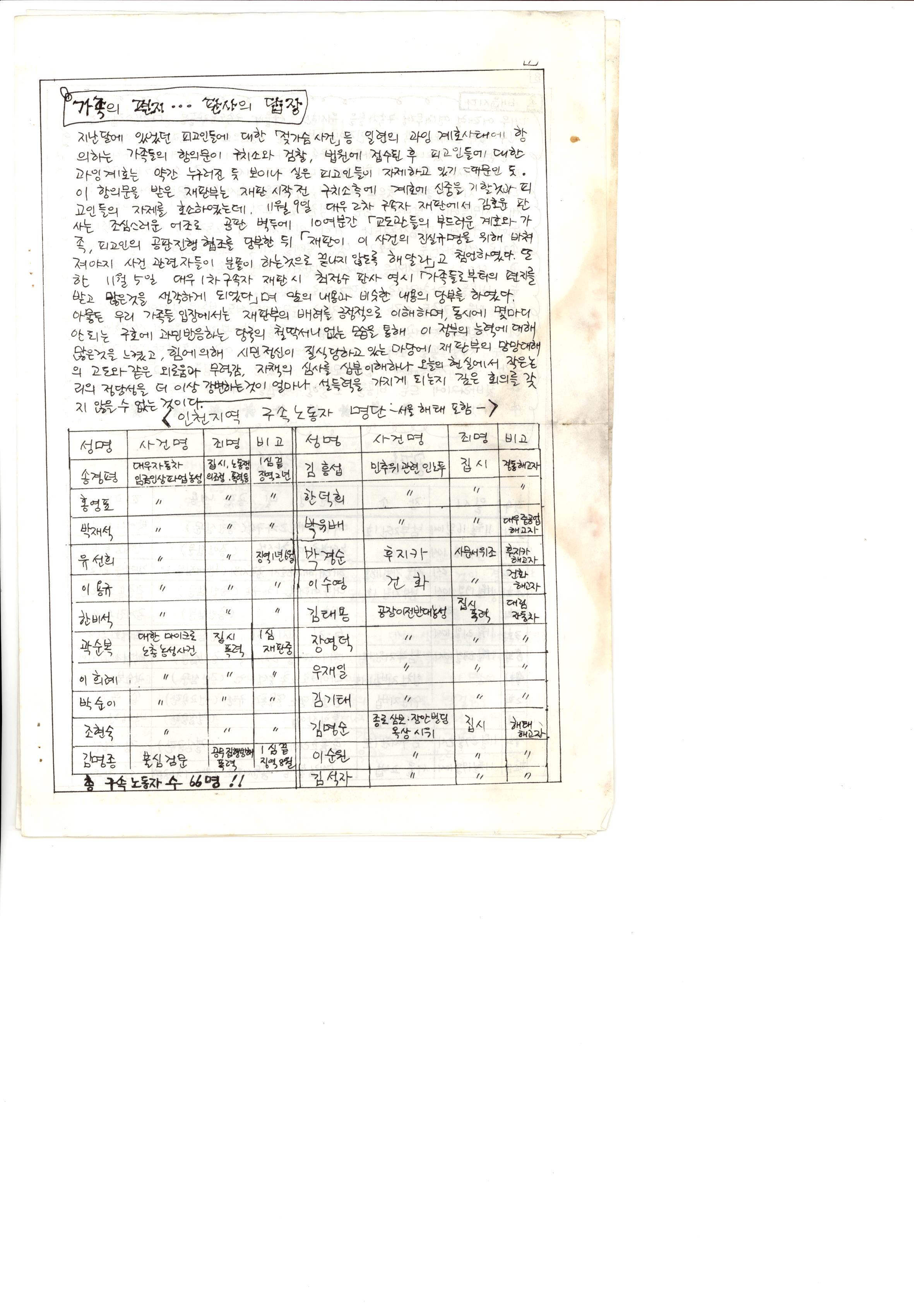 내용: 인천구속노동자 가족협의회 발족 : 연대농성사건 첫 선고, 근로자를 걷어차는 축구부, 로옴코리아 장영인 3차 공판 등