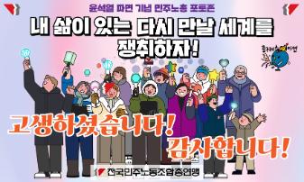 윤석열즉각퇴진・사회대개혁 비상행동은 윤석열이 파면된 다음날 제18차 범시민대행진을 서울 광화문 동십자각에서 열었다. 123일 동안 거짓과 폭력, 혐오에 맞선 진실과 연대, 빛의 혁명이 승리를 만들어냈다. 민주노총도 범시민대행진에 함께하며 “파면은 끝이 아니라 새로운 시작이다. 내란세력 청산과 새로운 사회를 향해 함께 나아가자”라고 결의를 다졌다. 2024년 12월3일 윤석열 비상계엄으로부터 123일이 지난 2025년 4월4일 시민들은 대통령 윤석열을 파면했다. 비상계엄 이튿날 오전 윤석열 퇴진으로 국민주권을 실현하고자 전면적 저항운동을 선포한 비상행동 또한 이날 범시민대행진까지 123일간 투쟁하며 민주주의의 승리를 가져왔다.