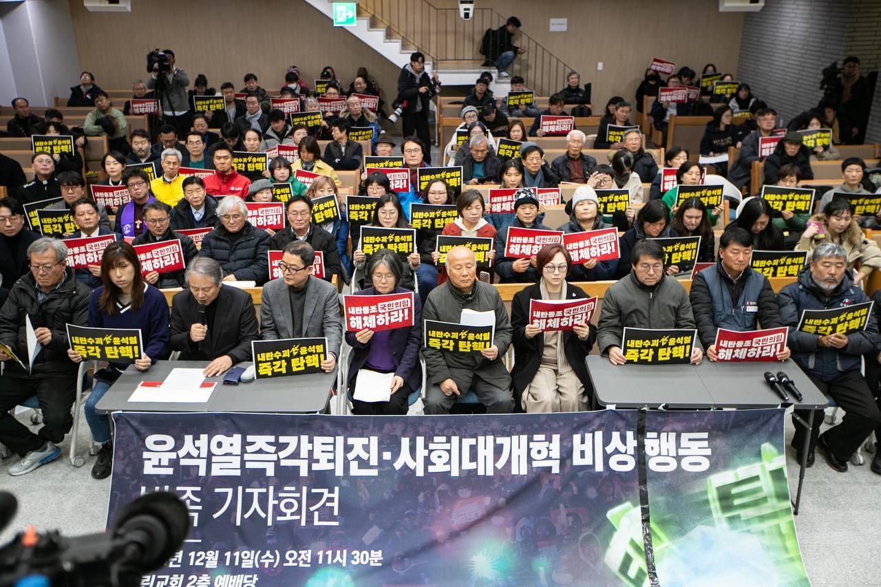 민주노총이 내란범 윤석열 탄핵, 구속과 체포를 요구하며 한남동으로 진격했다. 12월12일 오후 2시 세종대로에서 ‘내란주범 윤석열 즉각 탄핵 구속! 내란동조 국민의힘 해체! 노동자 시민대회’를 연 민주노총 1만 조합원과 시민들은 예정했던 행진방향을 여의도에서 한남동으로 돌렸다. 이날 오전 윤석열의 담화문 때문이었다. 윤석열의 담화문은 불법 계엄을 야당과 중국, 부정선거 탓이라며 망령된 단어들로 가득했다. 민주노총은 투쟁으로 윤석열을 감옥으로 보내고, 노동자의 노동권과 공공성이 보장되는 새로운 사회를 만드는 일에 주저하지 않을 것을 결의했다. 민주노총이 경찰의 봉쇄를 뚫고 윤석열과 김건희가 사는 한남동 대통령 관저 앞까지 진격하는 체포투쟁을 전개했다. 민주노총은 이날 오후 연 노동자・시민대회를 마친 뒤 여의도 국민의힘 당사까지 행진하려 했으나 용산 대통령집무실과 한남동 대통령 관저 앞으로 진로를 변경했다. 계엄내란의 책임을 야당과 국민에게 돌리는 모습으로 일관하자 민주노총은 남영역까지 행진한 뒤 대중교통을 이용해 한강진역에 재집결, 이후 경찰을 따돌리고 한남동 관저 앞까지 진격해 야간집회를 이어갔다.
