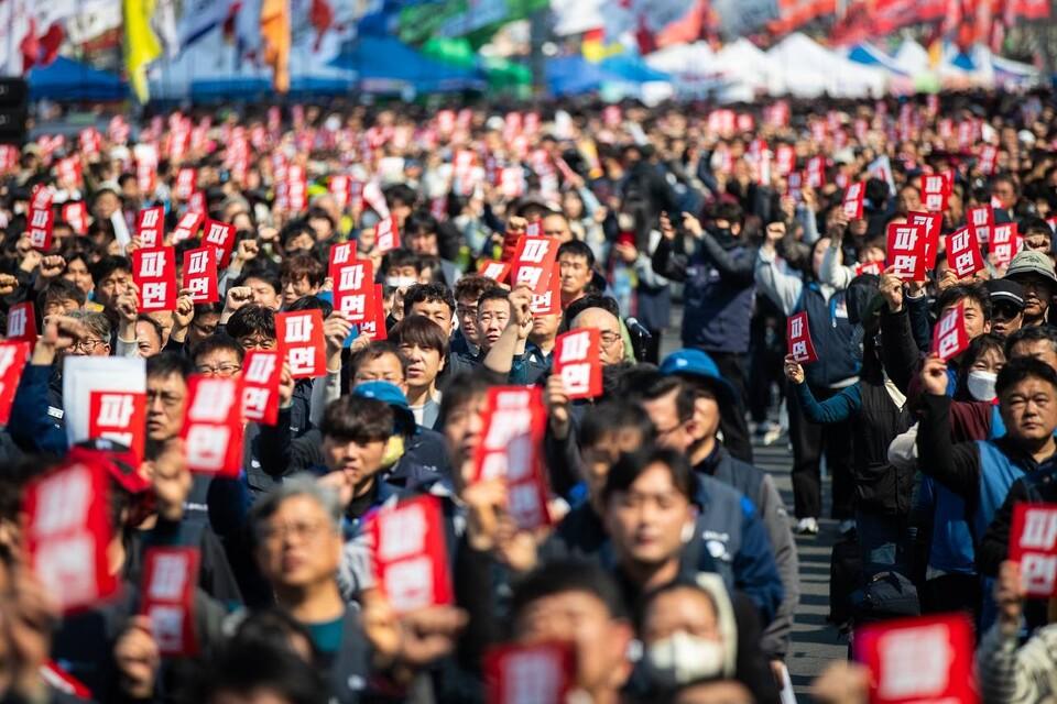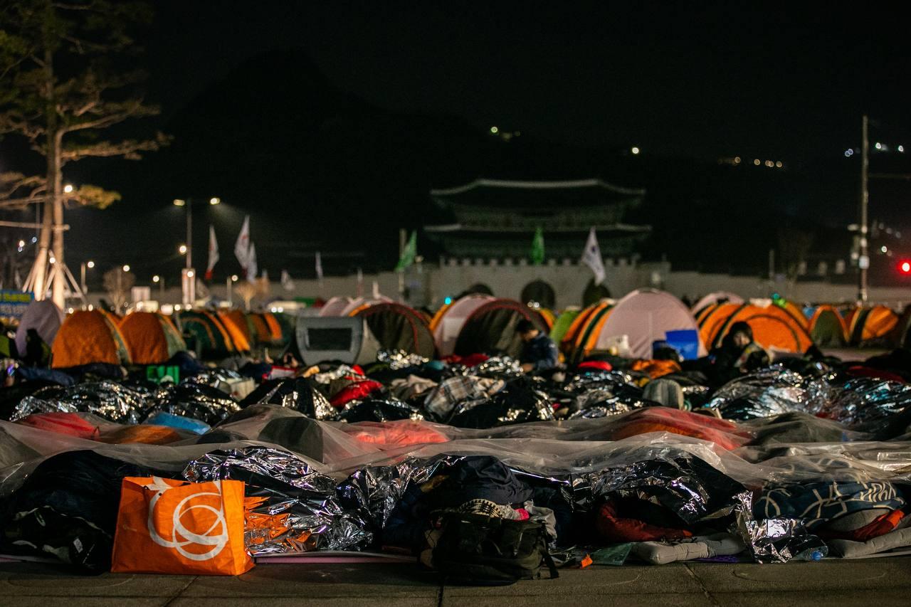 2025년 4월4일 새벽을 맞이한 노동자・시민은 지치지 않았다. 텐트, 은박비닐, 무릎담요, 손난로 등으로 추위를 막고 응원봉, 핸드폰 빛으로 2부를 이어갔다. 공연과 발언으로 채워진 두 번째 한마당이 마무리 된 뒤에도 잠을 못 이루는 참가자들도 있었다. 새벽이 왔으므로 아침은 온다. 농성에 참여한 모두가 헌법재판소의 8:0 전원일치 파면을 기다리며 아침을 맞았다. 파면의 새벽을 맞이하는 철야농성을 위해 2025년 4월3일 밤부터 윤석열 즉각파면! 민주노총 72시간 비상행동, 노동자・시민 한마당 1부가 열렸다. 헌법재판소 앞 안국동 사거리는 철야농성에 함께 하는 노동자 시민들이 가득 메웠다. 허기를 채우는 푸드트럭과 추위를 녹이는 난방버스도 철야농성장 주변에 자리잡았다. 노동자 노래패의 공연과 발언으로 채워진 1부로 4일 0시를 만났다. 2025년 4월4일 새벽을 맞이한 노동자・시민은 지치지 않았다. 텐트, 은박비닐, 무릎담요, 손난로 등으로 추위를 막고 응원봉, 핸드폰 빛으로 2부를 이어갔다. 공연과 발언으로 채워진 두 번째 한마당이 마무리 된 뒤에도 잠을 못 이루는 참가자들도 있었다. 새벽이 왔으므로 아침은 온다. 농성에 참여한 모두가 헌법재판소의 8:0 전원일치 파면을 기다리며 아침을 맞았다. 밤새 안국역 사거리를 지킨 노동자・시민들은 함께 밤을 새운 푸드트럭으로 속을 달래고 스트레칭으로 추위에 굳은 몸을 풀었다. 10시에 시작하는 헌법재판소의 탄핵선고를 기다리며 민주노총 조합원들은 광화문 일대로 이동해 출근선전전을 진행했다.