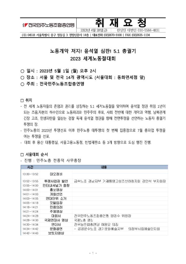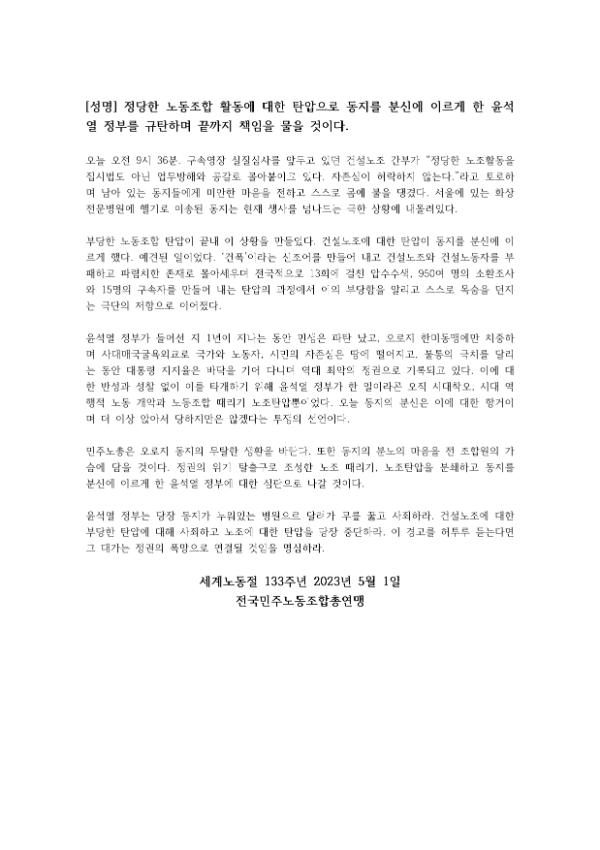 민주노총은 건설노조 및 가맹조직 조합원 3만여 명이 2023년 5월17일 오후 세종대로에 모여 ‘양회동 열사 염원 실현! 노동, 민생, 민주, 평화 파괴 윤석열 정권 퇴진! 민주노총 결의대회’를 열었다. 결의대회 뒤 참가자들은 용산 대통령실과 대학로 방면으로 행진하며 시민들에게 윤석열 정권 퇴진투쟁의 절박성과지지와 동참을 호소했다.