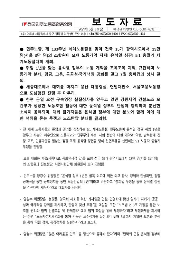 민주노총은 이날 전국 15개 광역시도에서 13만여 명이 모인 가운데 ‘노동개악 저지! 윤석열 심판! 5.1 총궐기 세계노동절대회’를 열었다. 3만5천여 조합원이 모인 서울대회를 마친 뒤에는 용산 대통령실과 서울지방고용노동청, 헌법재판소 등 3개 방향으로 행진했다. 용산 행진 과정에서 경찰의 폭력진압으로 조합원 2명이 연행되기도 했다.