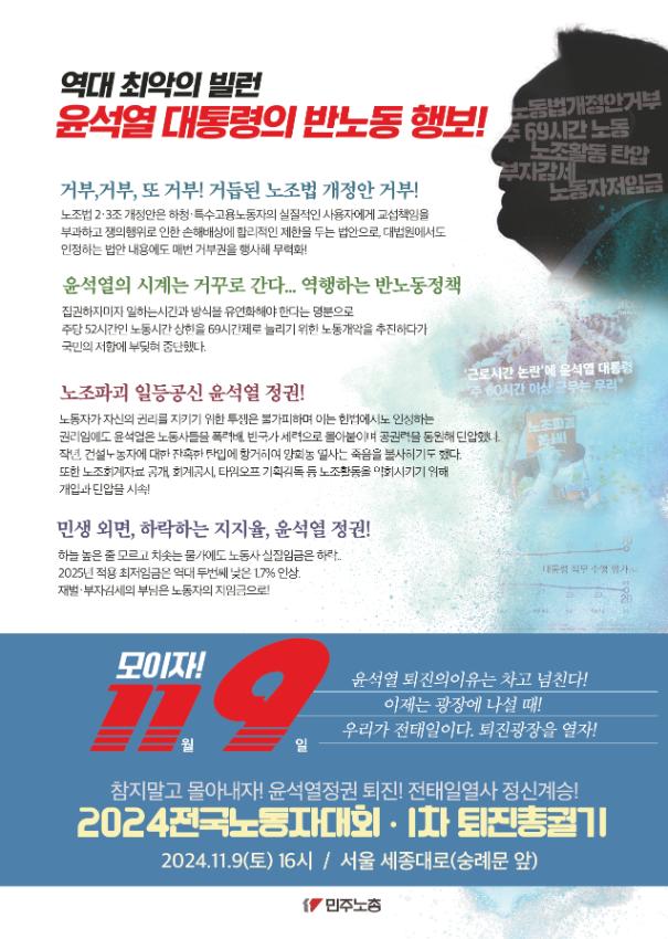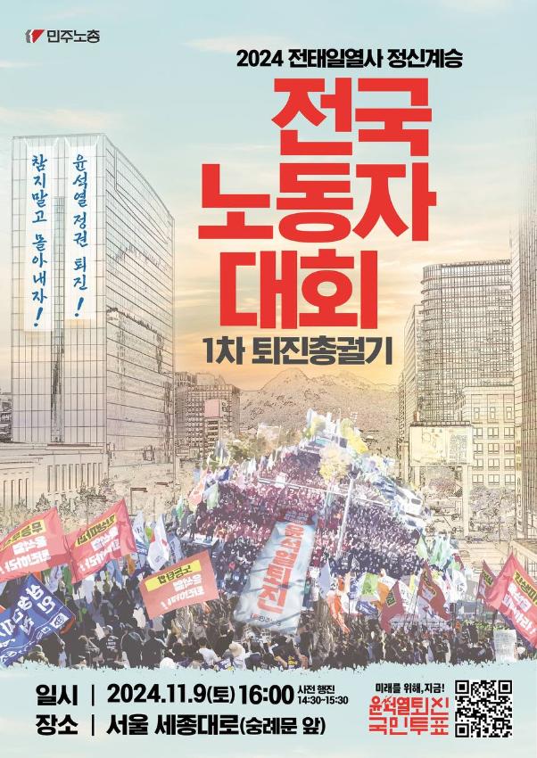 2024년 11월9일에는 민주노총 10만여 조합원이 서울 세종대로에 모여 윤석열정권 퇴진광장을 열기 위한 전태일열사 정신계승 2024 전국노동자대회를 열었다. 민주노총 16개 산별연맹이 도심 14곳에서 사전대회를 연 뒤 각기 다른 경로로 행진하며 본대회 장소로 모였다. 행진 과정에서 경찰의 과도한 도발과 폭력으로 인해 부상자 및 연행자가 다수 발생하기도 했다.