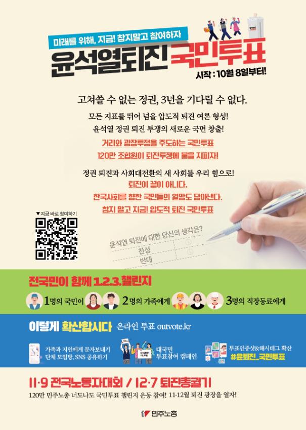 민주노총이 2024년 9월28일 전국 5만여 명의 노동자 민중이 모인 가운데 전국동시다발로 '퇴진광장을 열자! 9.28 윤석열정권 퇴진 시국대회'를 열었다. 5천여 명이 참여한 수도권대회는 숭례문에서 대회를 마치고 용산 대통령실로 행진했다. 이 과정에서 경찰의 폭력적인 탄압으로 플랜트건설노조 조합원 1명이 연행되는 일이 벌어졌다.