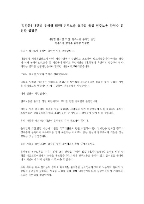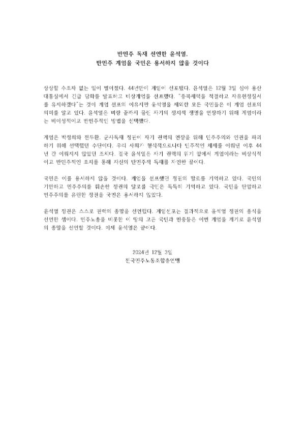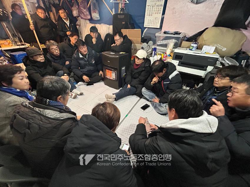 비상계엄이 선포된 직후 민주노총을 비롯한 시민들은 즉각 국회의사당 앞에 모여 국회를 사수하며 상황을 주시했다. 국회의원 비서관을 비롯해 시민들이 계엄군과 맞서는 동안 국회의원 190명은 본회의장에서 계엄 해제 요구를 의결했다. 민주노총은 12월4일 새벽 2시10분 국회 앞 금속노조 자동차판매연대지회 농성장에서 비상 중앙집행위원회를 열고 윤석열정권 퇴진 시까지 무기한 총파업 돌입과 전국민 비상행동을 진행한다는 지침을 정했다.
