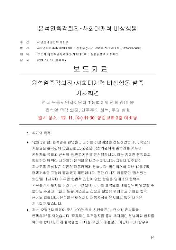 민주노총을 비롯한 전국의 1,700여 노동시민사회단체가 모여 ‘윤석열즉각퇴진・사회대개혁 비상행동’을 발족했다. 2024년 12월11일 오전 서울 향린교회 2층 예배당에 모인 이들은 회의를 거쳐 “윤석열 퇴진뿐 아니라 한국사회를 근본적으로 변화시킬 논의도 할 것”이라고 밝혔다. 비상행동의 활동목표와 방향은 △내란수괴 윤석열 즉각 퇴진 (탄핵 체포 구금) △내란동조 국민의힘 해체 △내란 동조자 처벌 △국민주권 실현 및 한국사회대개혁 등이다.