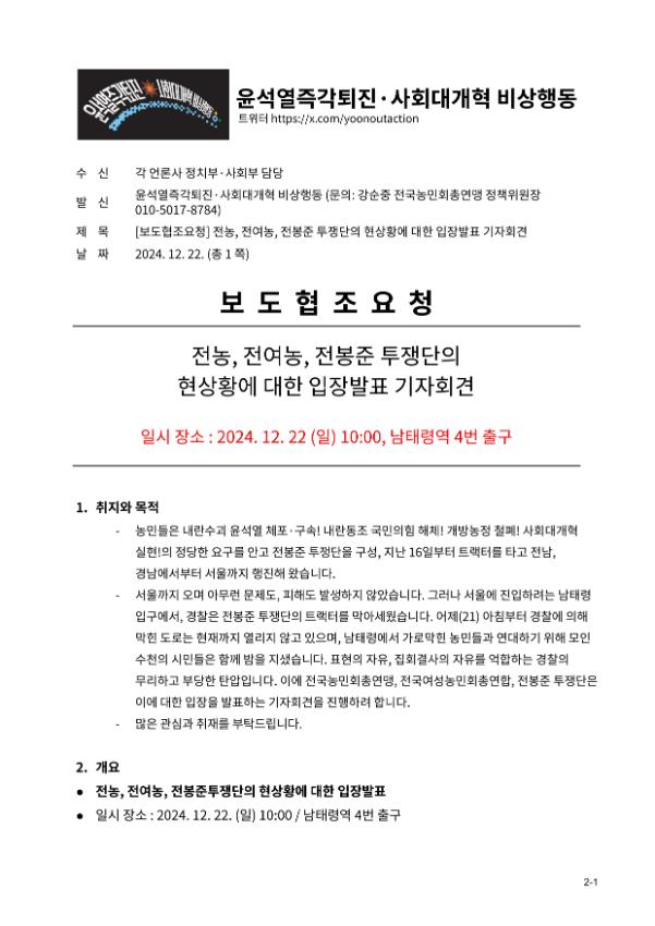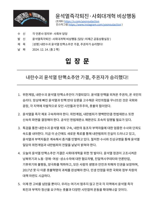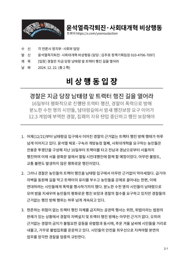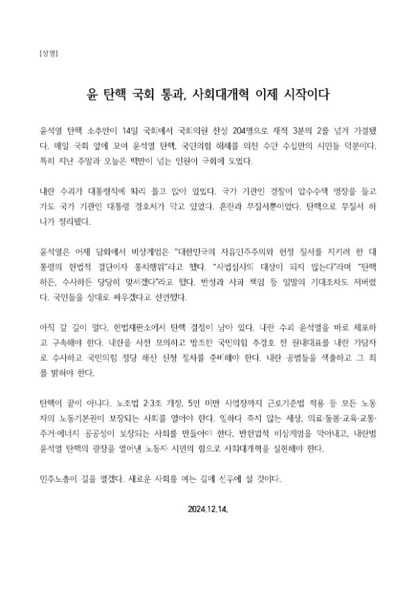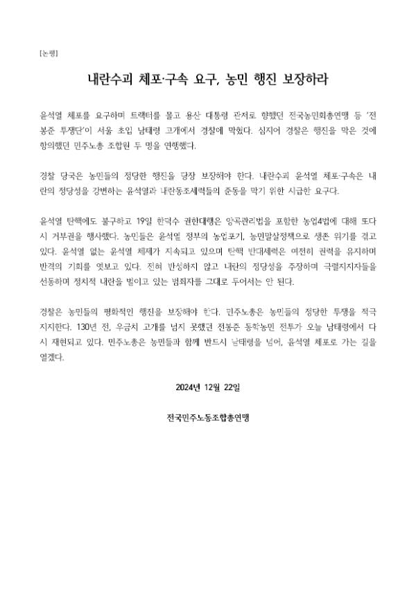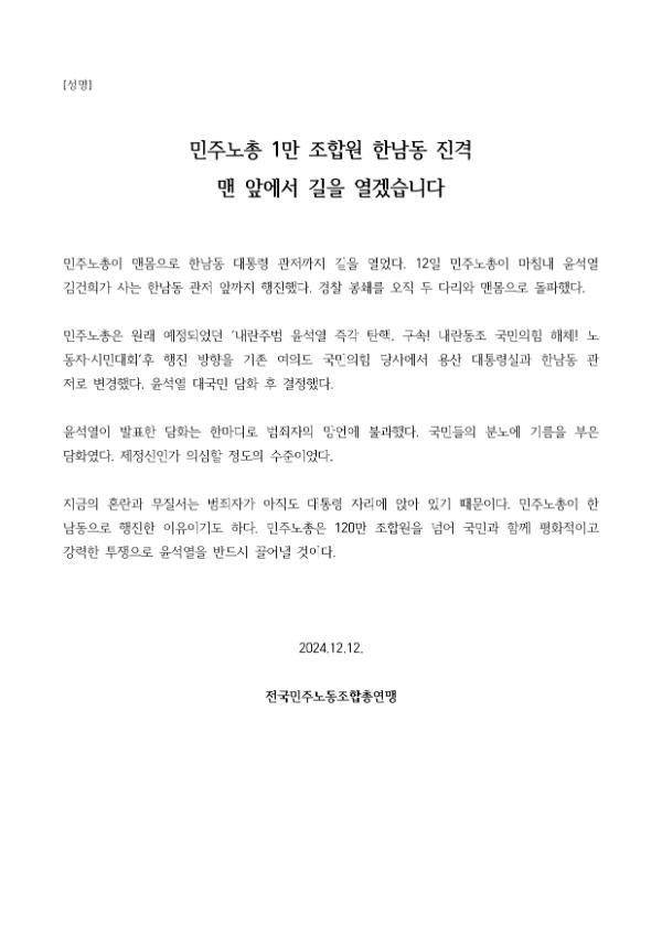 민주노총이 경찰의 봉쇄를 뚫고 윤석열과 김건희가 사는 한남동 대통령 관저 앞까지 진격하는 체포투쟁을 전개했다. 민주노총은 이날 오후 연 노동자・시민대회를 마친 뒤 여의도 국민의힘 당사까지 행진하려 했으나 용산 대통령집무실과 한남동 대통령 관저 앞으로 진로를 변경했다. 계엄내란의 책임을 야당과 국민에게 돌리는 모습으로 일관하자 민주노총은 남영역까지 행진한 뒤 대중교통을 이용해 한강진역에 재집결, 이후 경찰을 따돌리고 한남동 관저 앞까지 진격해 야간집회를 이어갔다.