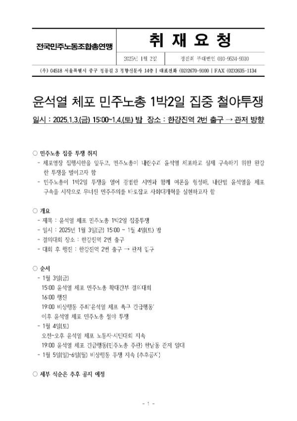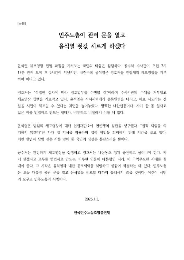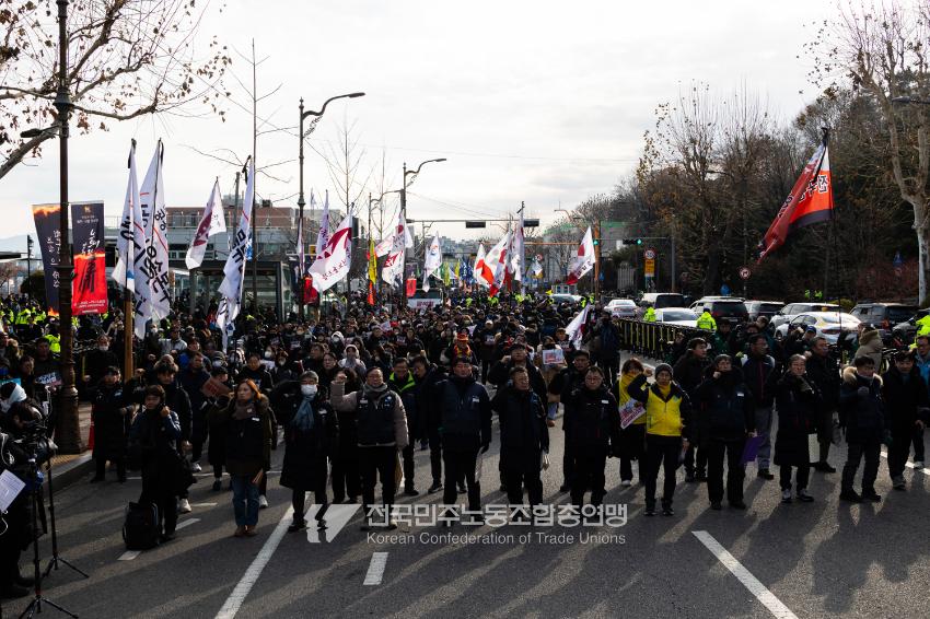 2025년 1월3일 오후 한강진역 결의대회를 마친 민주노총 조합원들은 한남동 대통령 관저 인근까지 행진했다. 오후 4시40분경에는 폴리스 라인을 넘어 민주노총이 애초 신고했던 집회장소로 진격했다. 경찰은 민주노총이 한남초등학교 인근에 집회신고를 냈음에도 이를 받아들이지 않았다.