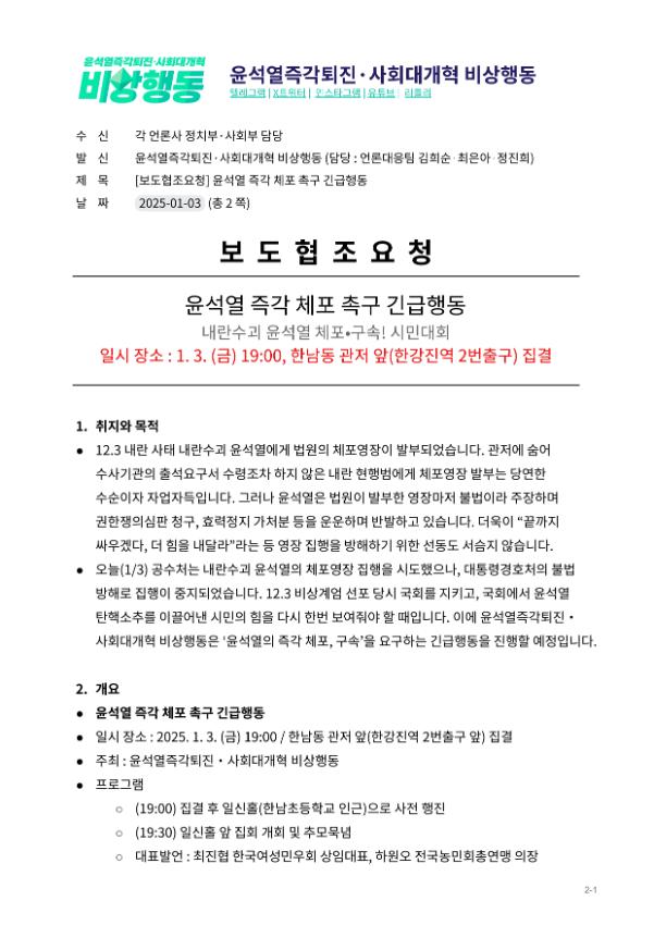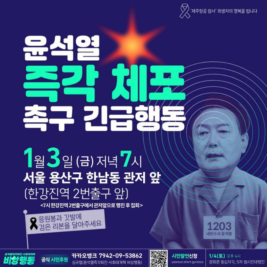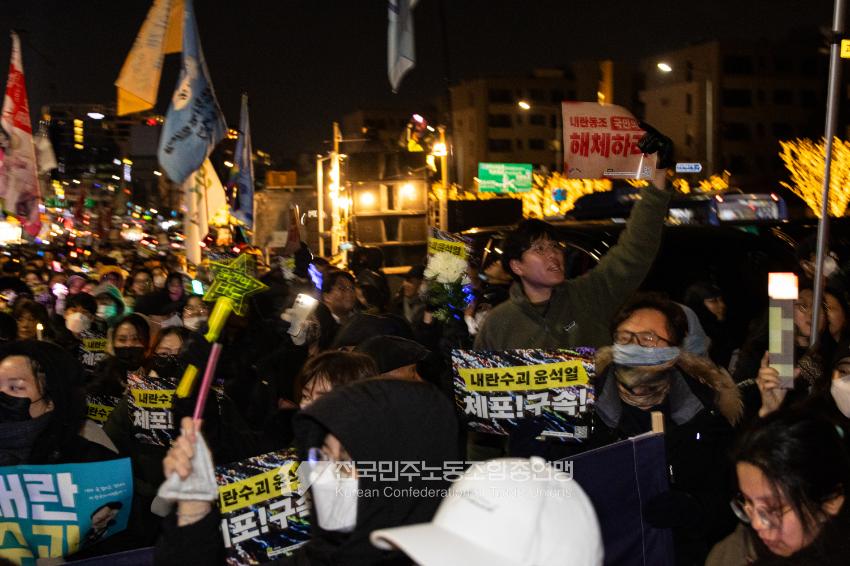 윤석열즉각퇴진・사회대개혁 비상행동은 2025년 1월3일 오후 한강진역 인근에서 집회를 마친 뒤 민주노총이 밤샘투쟁을 이어가는 한남대로로 향했다. 제2의 남태령이 된 한남동은 민주노총 조합원들과 SNS에서 소식을 접하고 속속 모여든 시민들로 가득 메워졌다. 윤석열 체포영장 집행 첫 시도가 불발된 데 분노한 시민들이 함께 자리를 지켰다.