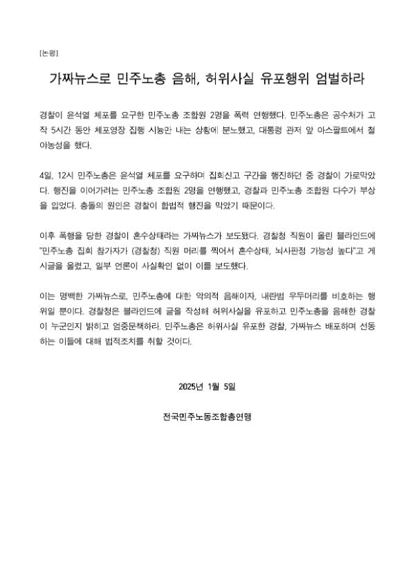 경찰이 2025년 1월4일 한남동 집회 중 민주노총 조합원 2명을 폭력적으로 연행한 상황에서 민주노총이 5일 오전 10시30분 서울 마포경찰서를 찾아 조속한 석방을 촉구하고 경찰을 규탄하는 기자회견을 열었다. 연행된 조합원은 금속노조 거제통영고성하청지회 조합원과 서비스연맹 학비노조 소속 급식노동자다. 두 조합원은 밤새 은평경찰서에 수감됐다 이날 오전 마포경찰서로 이감됐다. 민주노총과 진보정당, 시민들은 두 조합원이 연행된 순간부터 밤새 은평경찰서 앞을 지킨 것으로 알려졌다.