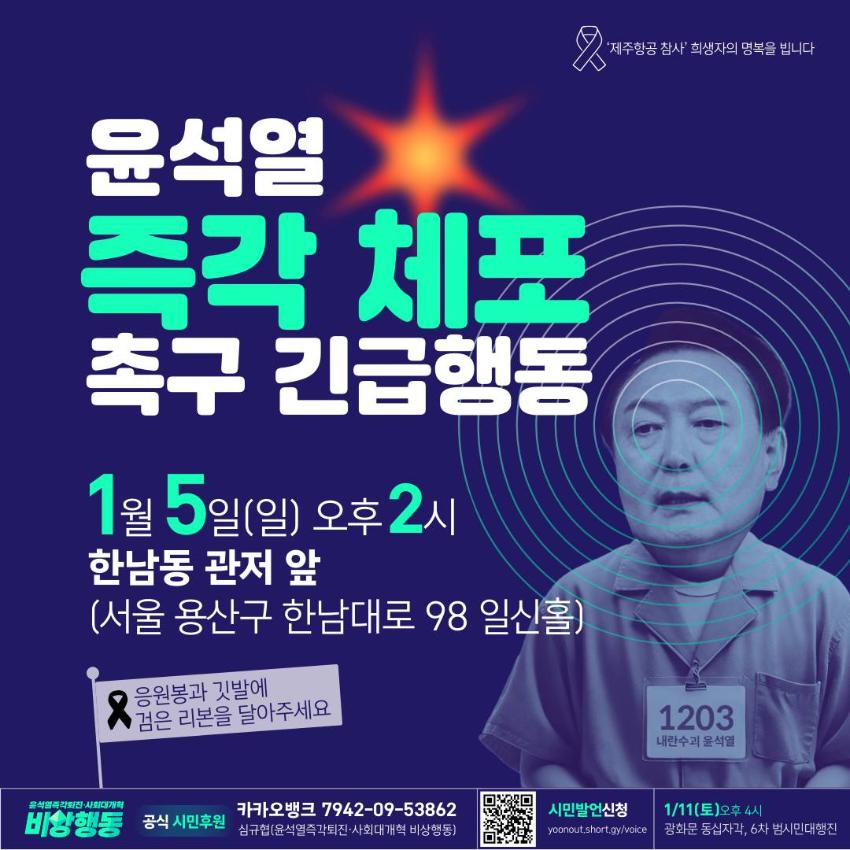 2025년 1월4일 광화문 동십자각에서 윤석열 즉각 체포! 긴급행동 집회를 마친 시민들이 한강진역 인근에 모여 함께 행진으로 집회장소에 모였다. 한남대로를 점거한 민주노총과 시민들의 노숙투쟁이 이어지는 가운데, 민주노총과 비상행동은 노숙투쟁을 하루 더 연장했다.