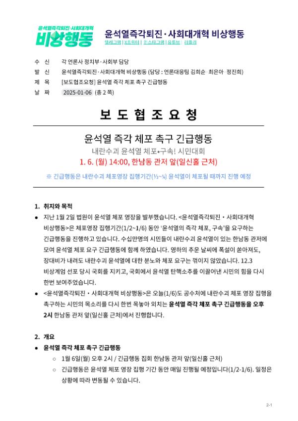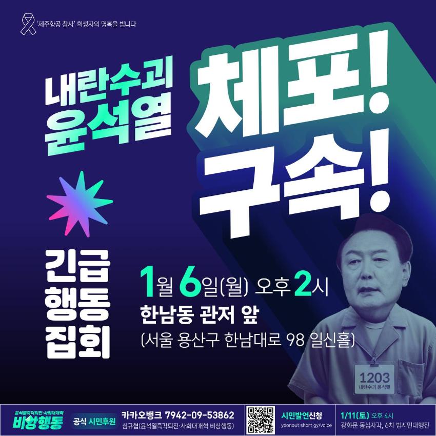 민주노총이 기획하고 윤석열즉각퇴진・사회대개혁 비상행동과 시민들이 함께한 3박4일 한남동 윤석열 체포 노숙투쟁은 2025년 1월6일 오후 2시 열린 긴급행동 집회로 마무리됐다. 양경수 민주노총 위원장은 마지막 발언자로 나서 “처음 투쟁을 시작할 때 시민들이 달려와 줄 것을 믿었고 믿음은 현실이 됐다. 3박4일간 동지가 된 우리는 깨지지 않는 연대로 나아갈 것”이란 말로 ‘한남동 대첩’에 함께한 시민들에게 감사를 전했다.