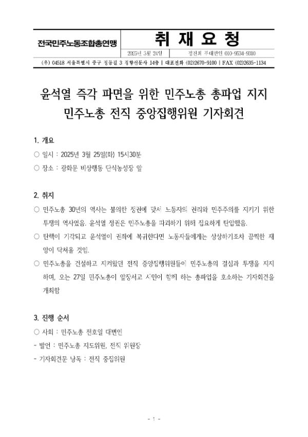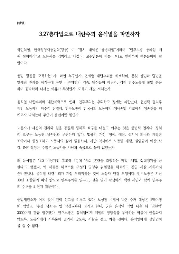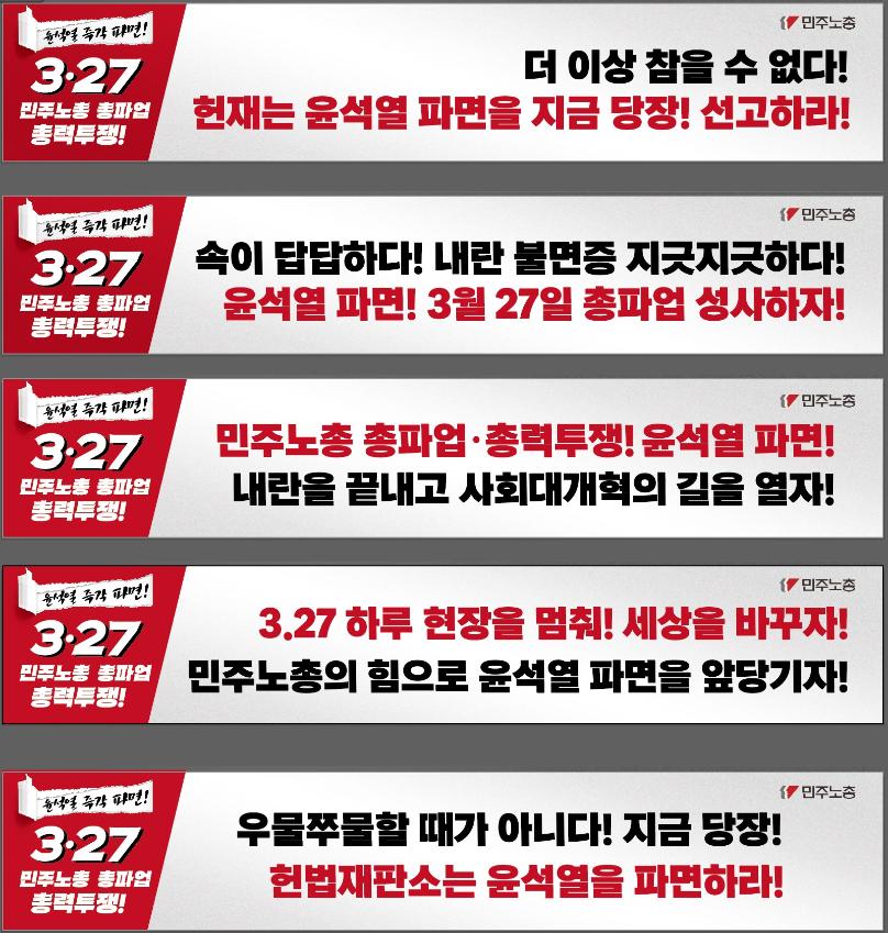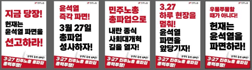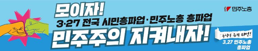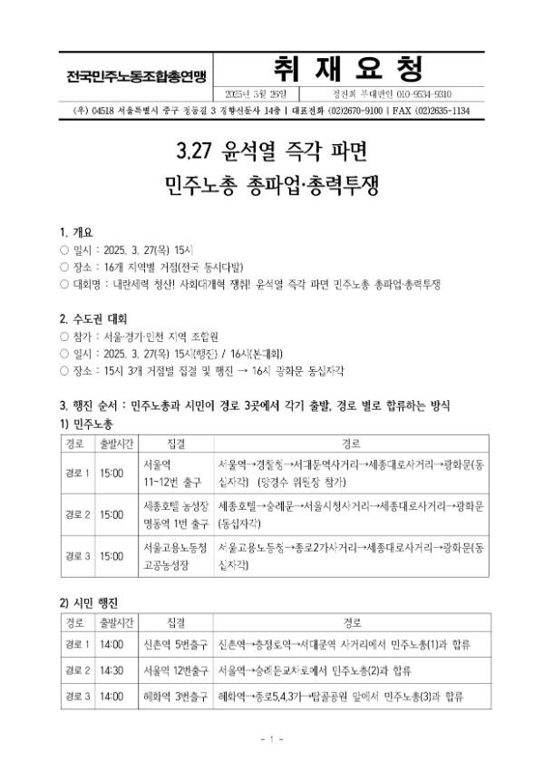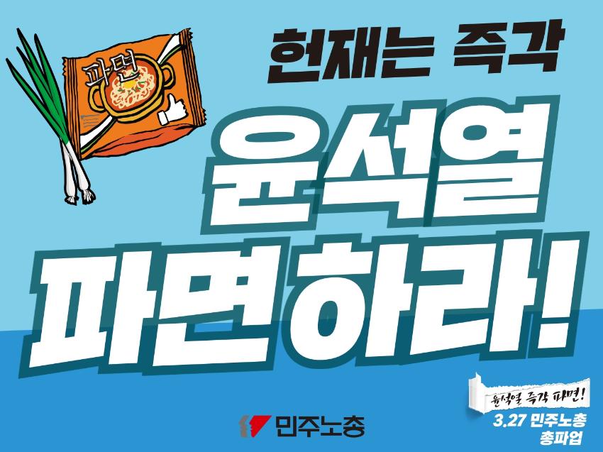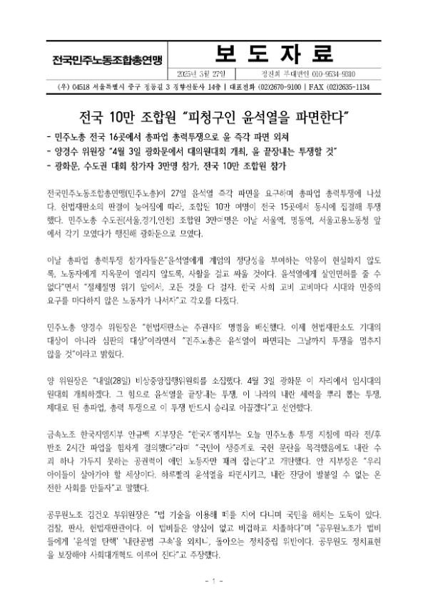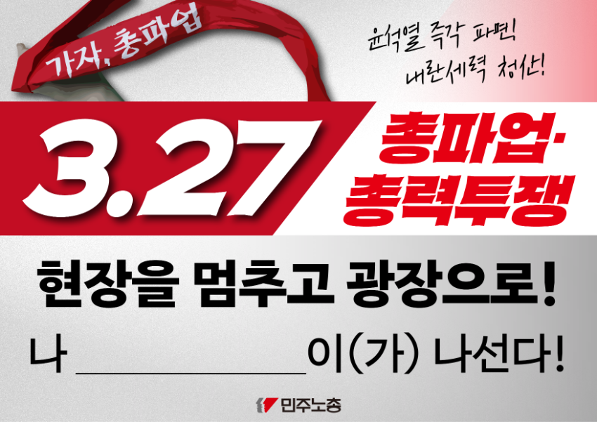 민주노총 조합원 10만여 명이 2025년 3월27일 하루 일손을 놓고 총파업으로 윤석열 즉각 파면을 압박했다. 파업에 나선 조합원들은 서울을 비롯한 전국 14개 거점에서 전국 동시다발 총파업・총력투쟁 집회를 열었다. 수도권대회는 서울역과 세종호텔농성장, 거통고 조선하청지회농성장 세 곳을 출발해 광화문으로 집결했다.