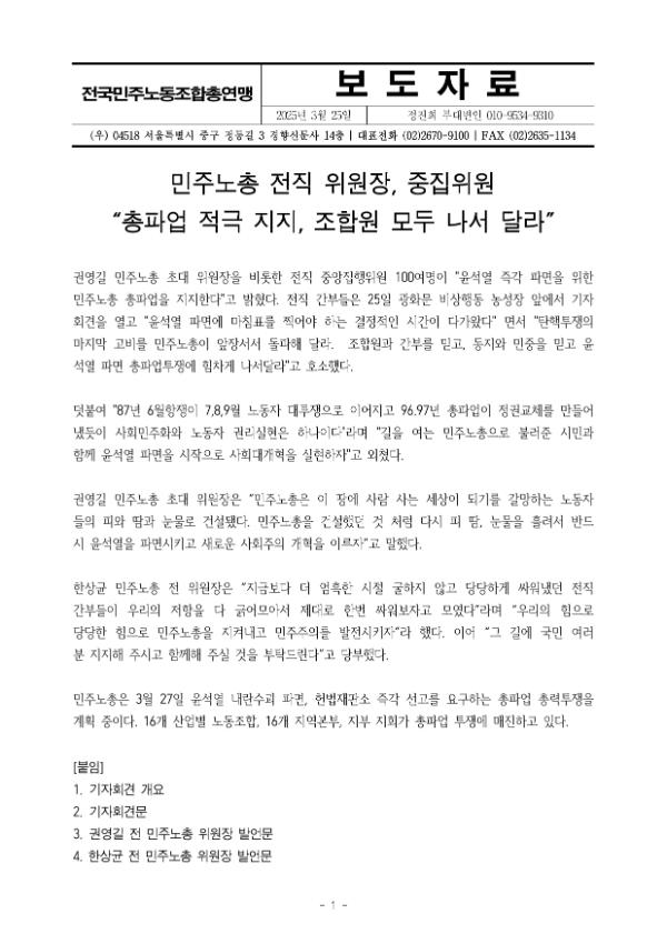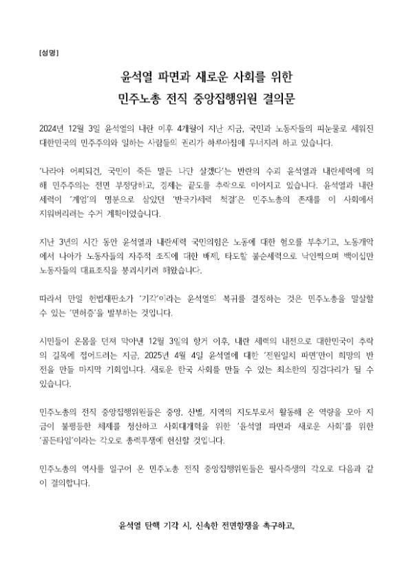 권영길 민주노총 초대 위원장을 비롯한 전직 중앙집행위원 100여 명이 2025년 3월25일 서울 광화문 서십자각 인근 비상행동 단식농성장에 모여 “윤석열 즉각 파면을 위한 민주노총 총파업과 시민총파업에 함께 해달라”라고 시민들에게 호소했다. 전직 중집위원들은 “1987년 6월항쟁이 7~9월 노동자대투쟁으로 이어지고, 1996~1997년 총파업이 정권 교체를 만들어냈듯이 사회민주화와 노동자 권리실현은 하나”라고 강조했다. “탄핵투쟁의 마지막 고비를 민주노총이 앞장서서 돌파해달라”고도 주문했다.