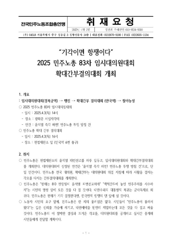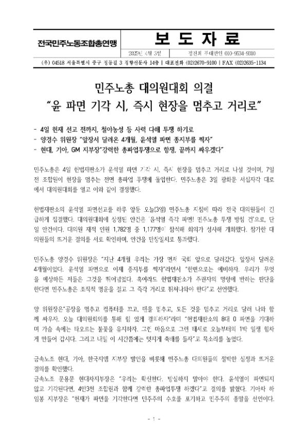 광장 대의원대회 안건은 ’윤석열 파면 투쟁 결의 건’ 단일 안건으로, 수정을 거쳐 대의원 만장일치로 통과했다. 탄핵 기각 시 즉각 전조직 총파업 투쟁에 돌입하고 탄핵 인용 시 5일 민주노총 조합원들은 각 지역에서 윤석열 파면 승리대회를 열기로 했다. 광장 대의원대회는 민주노총 산별노조 대표자들 모두의 결의 발언을 마지막으로 마무리됐다.