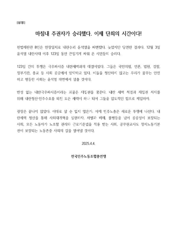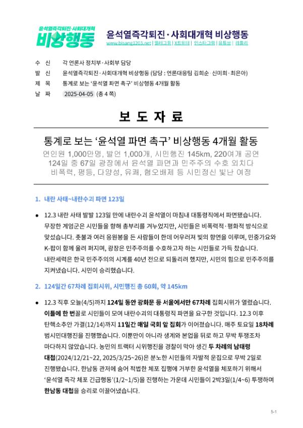 2024년 12월3일 윤석열 비상계엄으로부터 123일이 지난 2025년 4월4일 시민들은 대통령 윤석열을 파면했다. 비상계엄 이튿날 오전 윤석열 퇴진으로 국민주권을 실현하고자 전면적 저항운동을 선포한 비상행동 또한 이날 범시민대행진까지 123일간 투쟁하며 민주주의의 승리를 가져왔다.