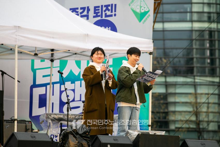 윤석열이 파면된 순간 민주노총도 환호를 내질렀다. 이후 ‘너희들의 시대는 끝났다’, ‘응원봉과 함께한 모든 날이 좋았다’라는 두 대형 현수막을 들고 안국역에서 광화문광장까지 행진했다. 민주노총은 성명을 통해 “이제 새로운 투쟁에 나선다. 내란세력 청산을 통해 사회대개혁을 실현하고 노동존중 사회의 길을 열어낼 것”이라고 전했다.