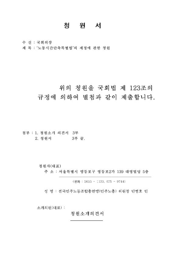 [청원서] 노동시간단축특별법 제정에 관한 청원서