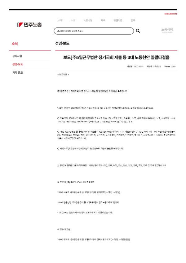 [보도자료] 주5일근무법안 정기국회 제출 등 3대 노동현안 일괄타결을 다시 한 번 촉구합니다