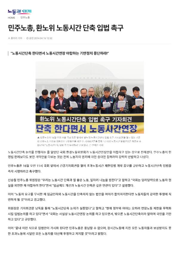 [기사] 민주노총, 환노위 노동시간 단축 입법 촉구