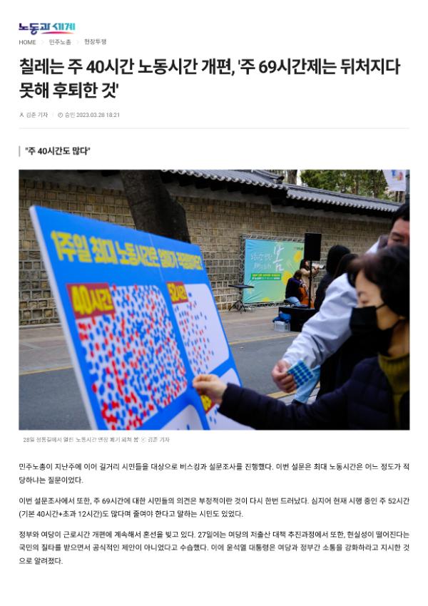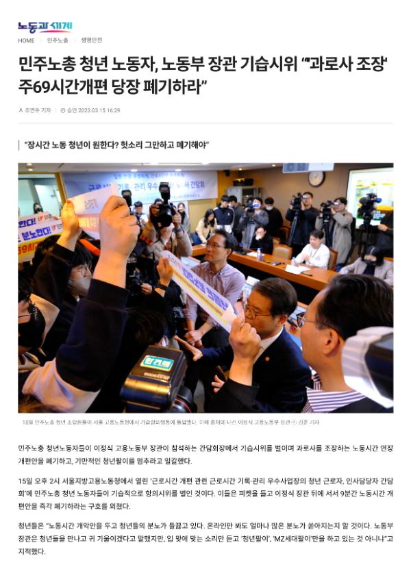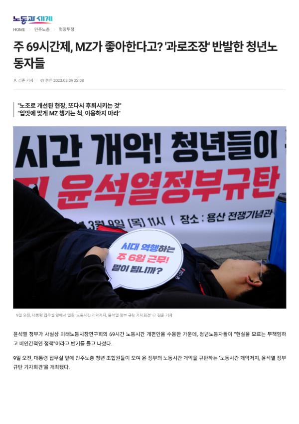 [기사] 주 69시간제, MZ가 좋아한다고 '과로조장' 반발한 청년노동자들