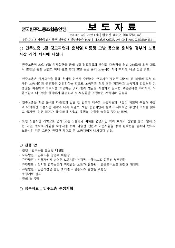 [보도자료] 윤석열 정부 노동시간 개악 안 폐기투쟁 발표 민주노총 중앙집행위원회 기자회견