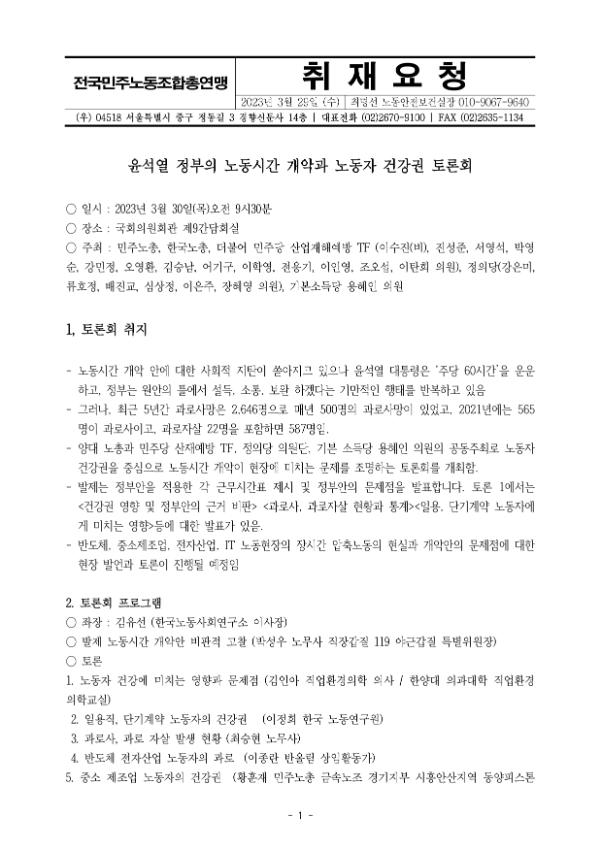 [취재요청] 윤석열 정부의 노동시간 개악과 노동자 건강권 토론회