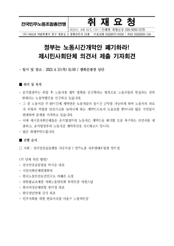 [취재요청] 정부는 노동시간개악안 폐기하라! 제시민사회단체 의견서 제출 기자회견