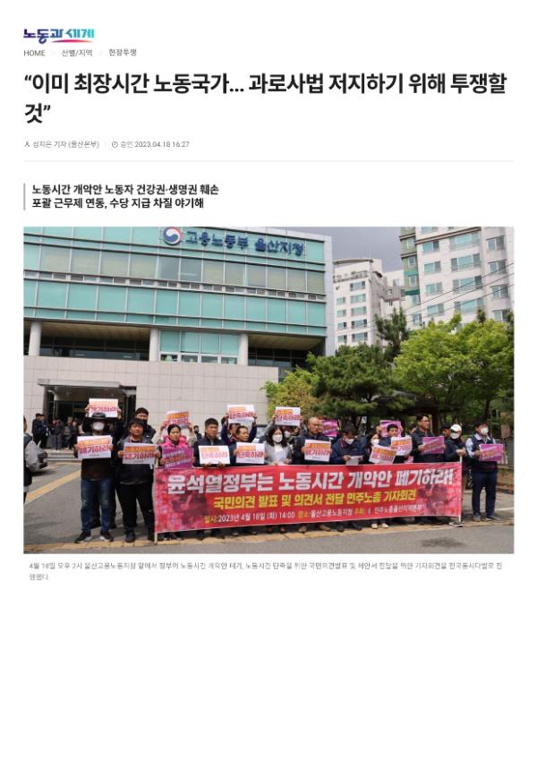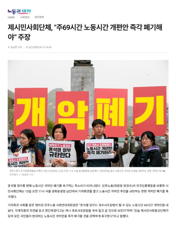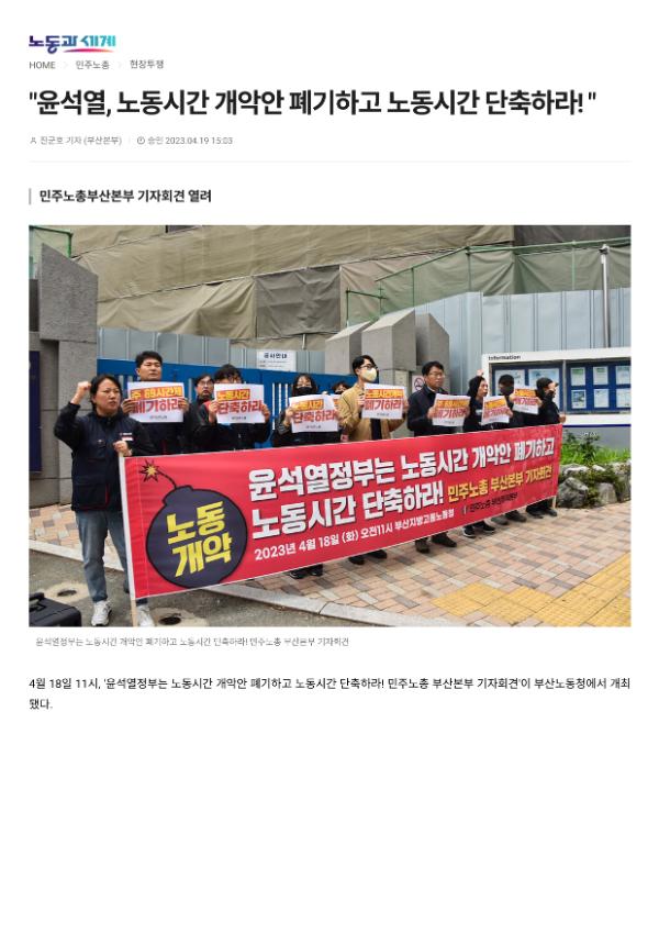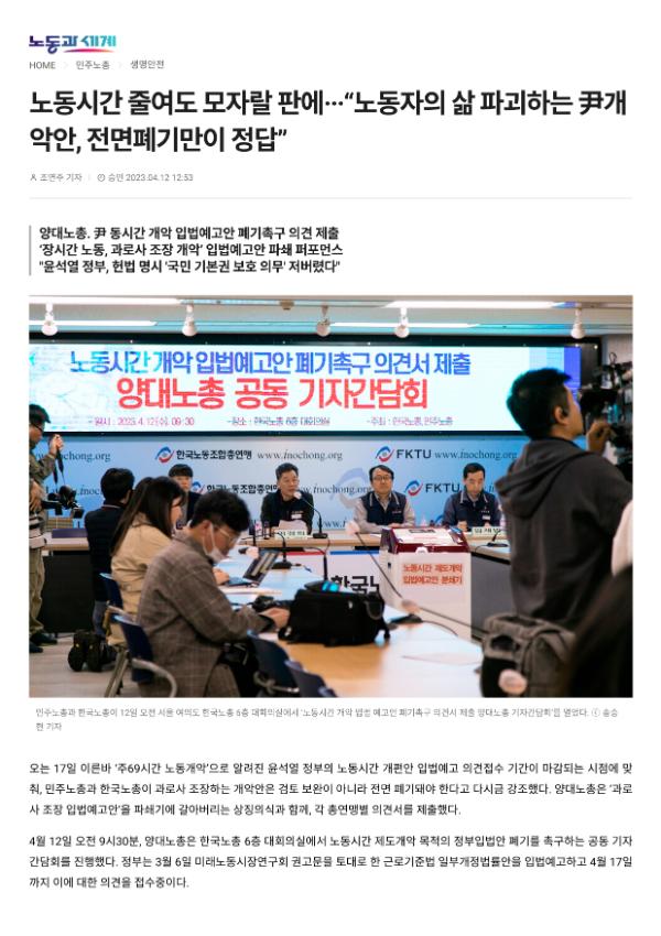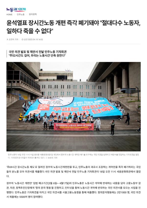 [기사] 노동시간 줄여도 모자랄 판에···“노동자의 삶 파괴하는 尹개악안, 전면폐기만이 정답”
