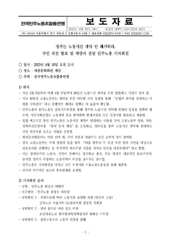 [보도자료] 정부는 노동시간 개악 안 폐기하라. 국민 의견 발표 및 제안서 전달 민주노총 기자회견