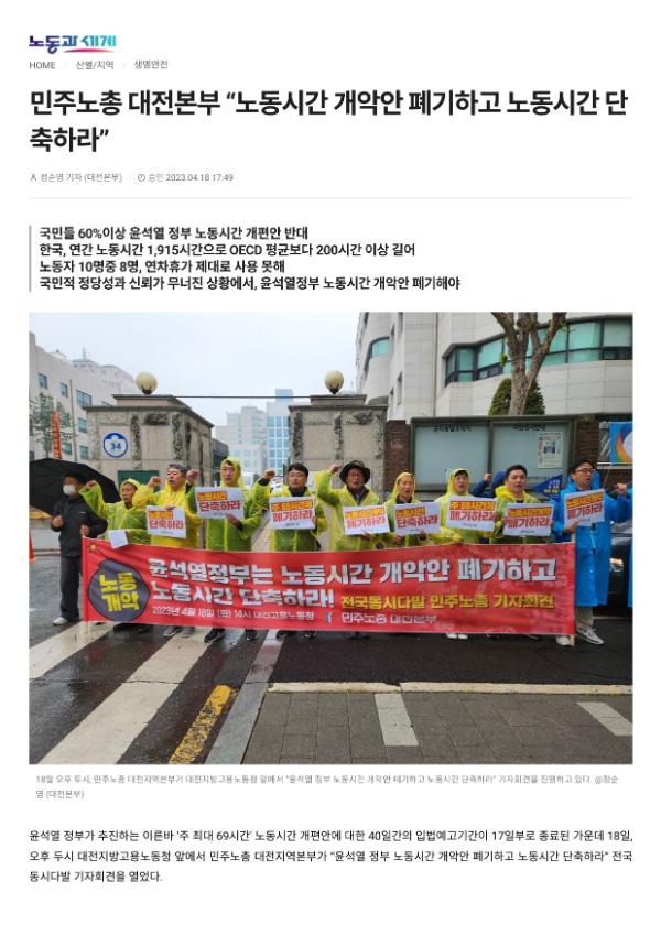 [기사] 민주노총 대전본부 “노동시간 개악안 폐기하고 노동시간 단축하라”