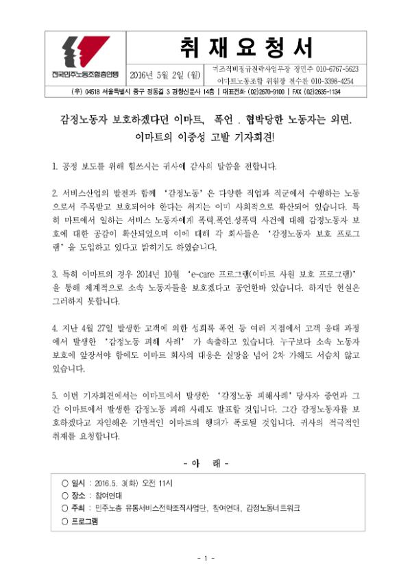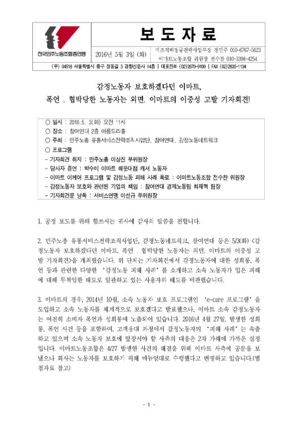 [보도자료] 감정노동자 보호하겠다던 이마트, 폭언․협박당한 노동자는 외면.이마트의 이중성 고발 기자회견