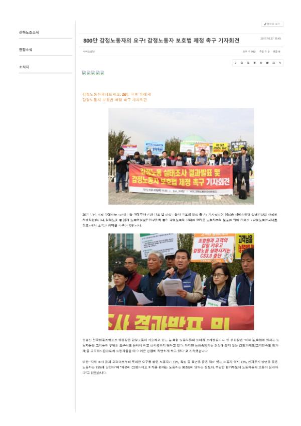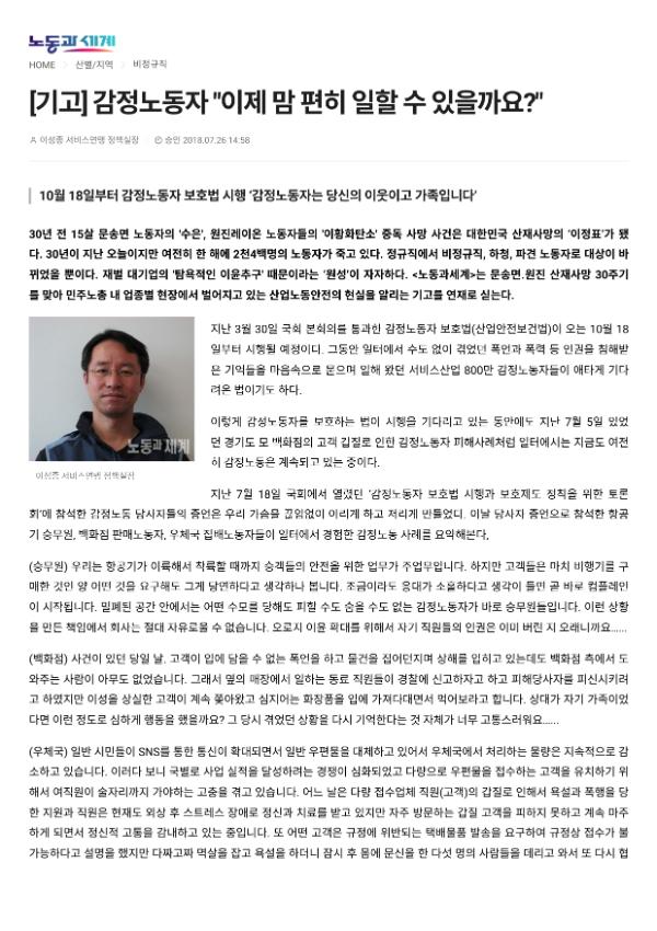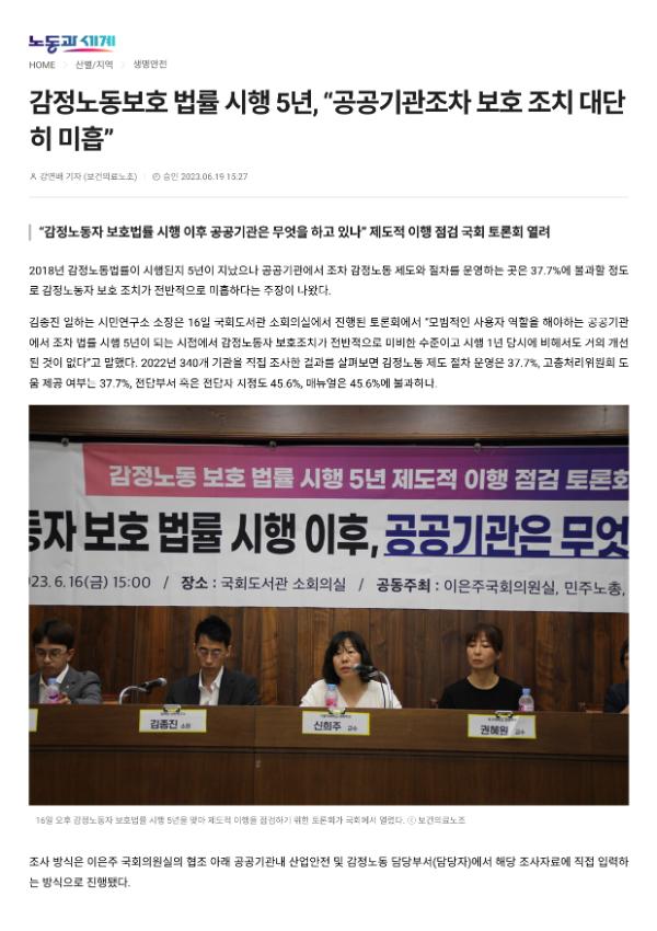 [기사] 감정노동보호 법률 시행 5년, “공공기관조차 보호 조치 대단히 미흡”