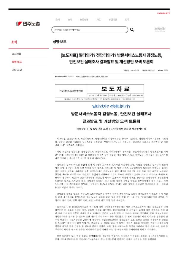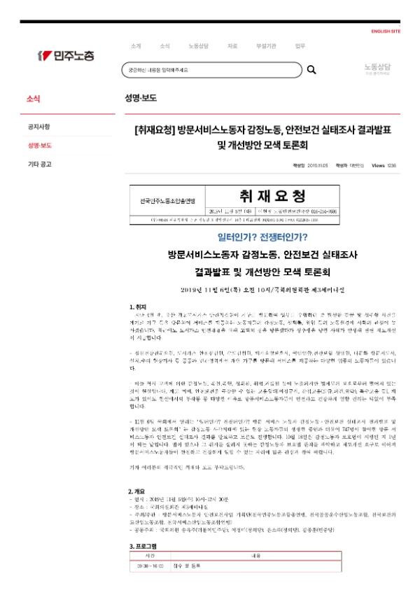 [보도자료] 일터인가 전쟁터인가 방문서비스노동자 감정노동, 안전보건 실태조사 결과발표 및 개선방안 모색 토론회