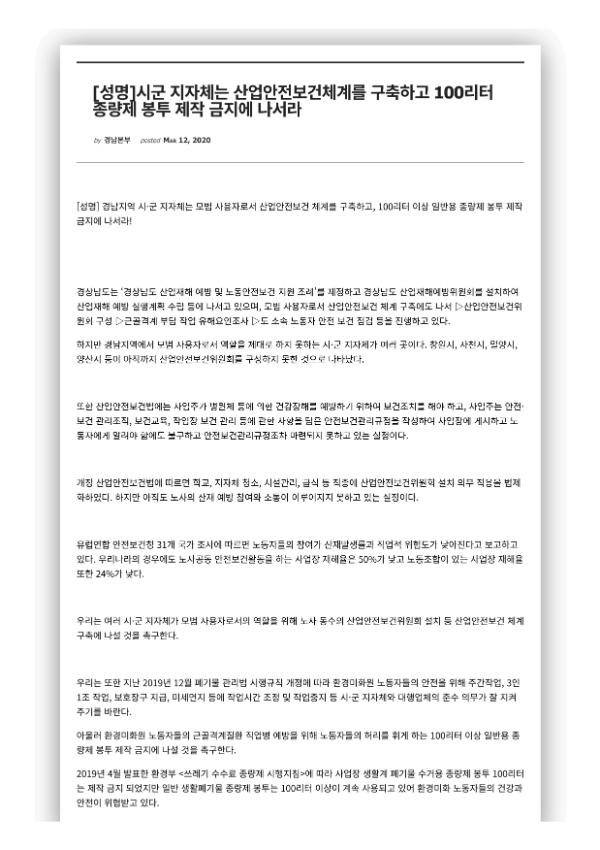 [성명] 시군 지자체는 산업안전보건체계를 구축하고 100리터 종량제 봉투 제작 금지에 나서라-출처경남본부