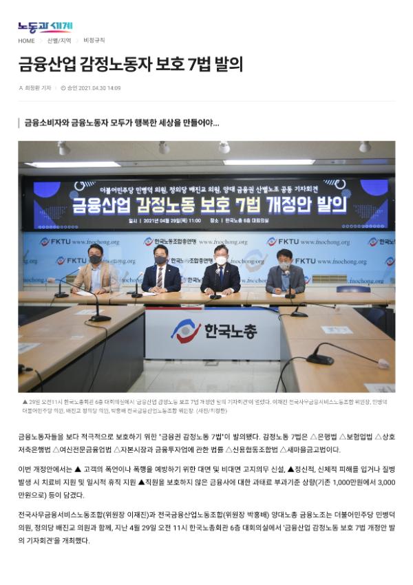 [기사] 금융산업 감정노동자 보호 7법 발의