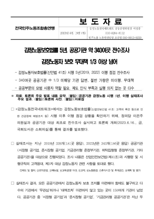 [보도자료] 감정노동보호법률 5년, 공공기관 약 340여곳 전수조사 감정노동자 보호 무대책 13 이상 넘어